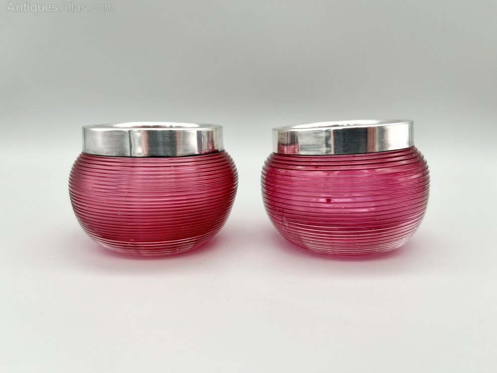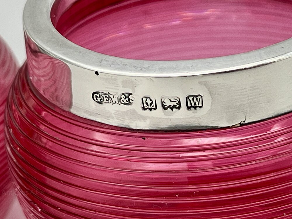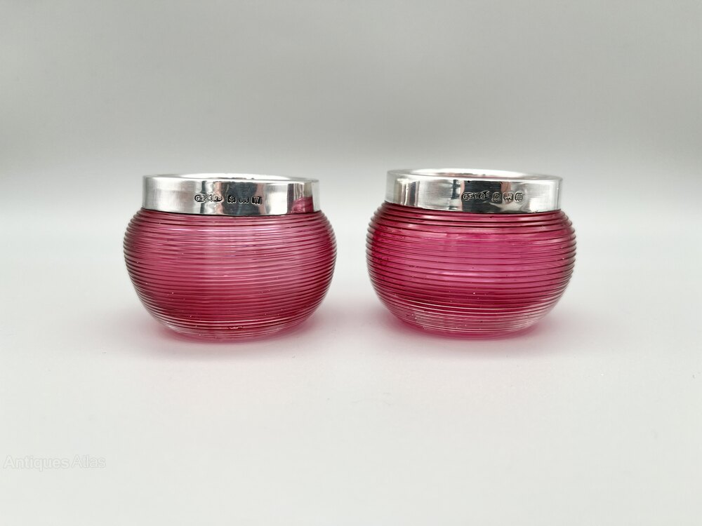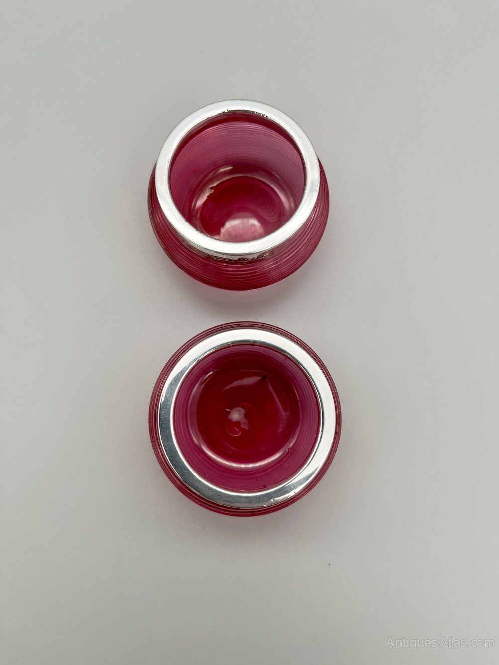 This is a lovely Pair of George V Ruby Glass Match Strikers with Sterling Silver Rims. The hand blown strikers are circular with flat bottoms and ribbed sides for striking vesta matches on. The silver top rims are plain.