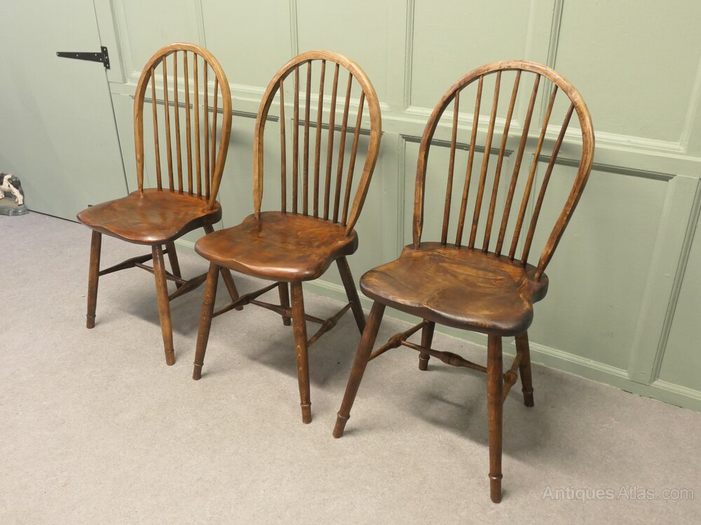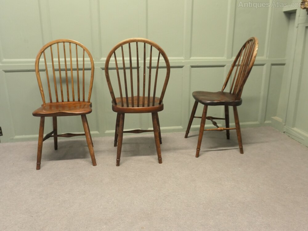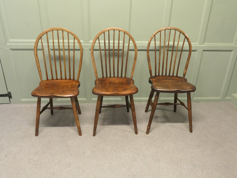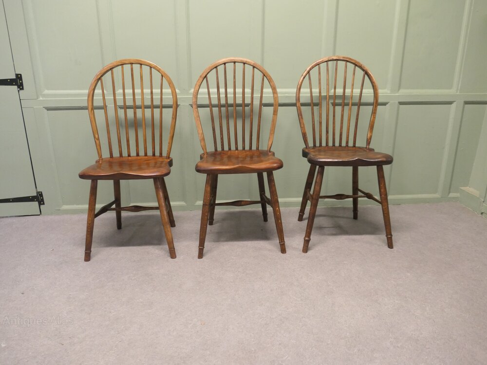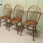 A superb trio of chairs these have been hand made in Oak and pine, the chunky saddle seats are very comfortable, they are hooped stick backs and they are approximately 37” high at the back, 17” wide and 16” deep, the seat height is 19”