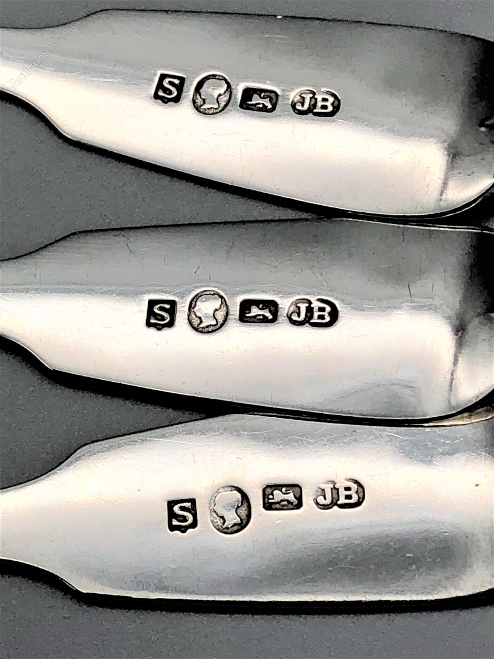 The hallmarks on the underside of the stem are well struck and clear to read. They show the lion passant for Sterling Silver, the date letter "S" for 1853, the Queen Victoria duty mark and the JB makers' mark for James Barber.