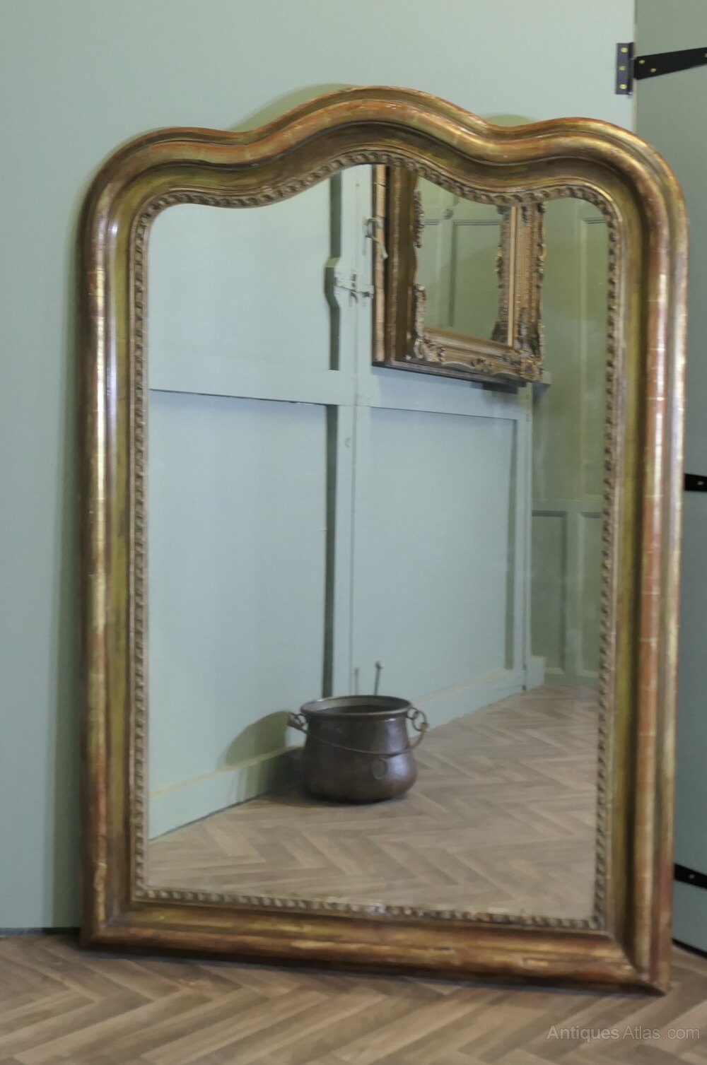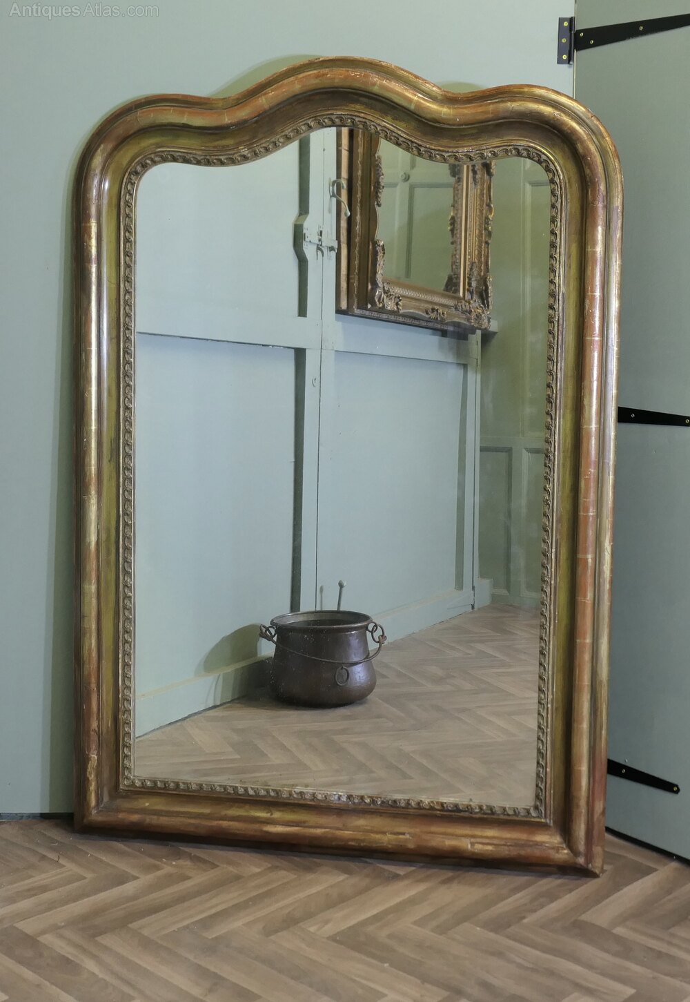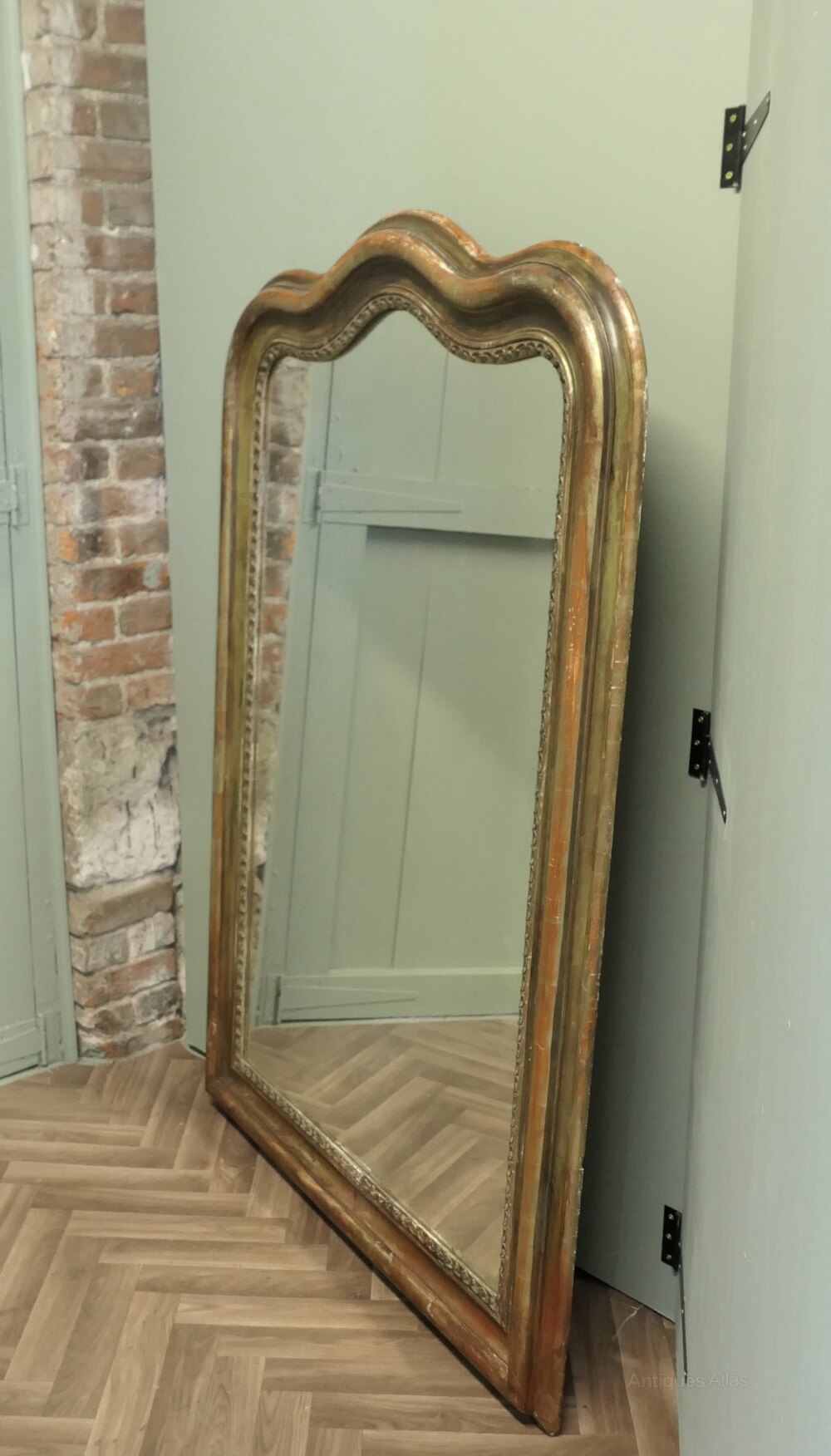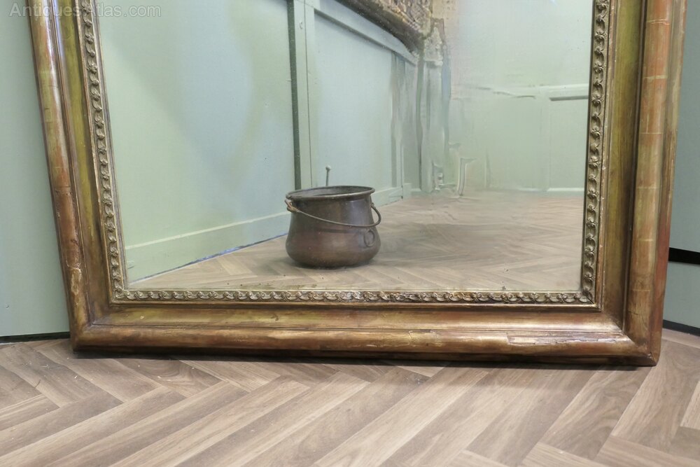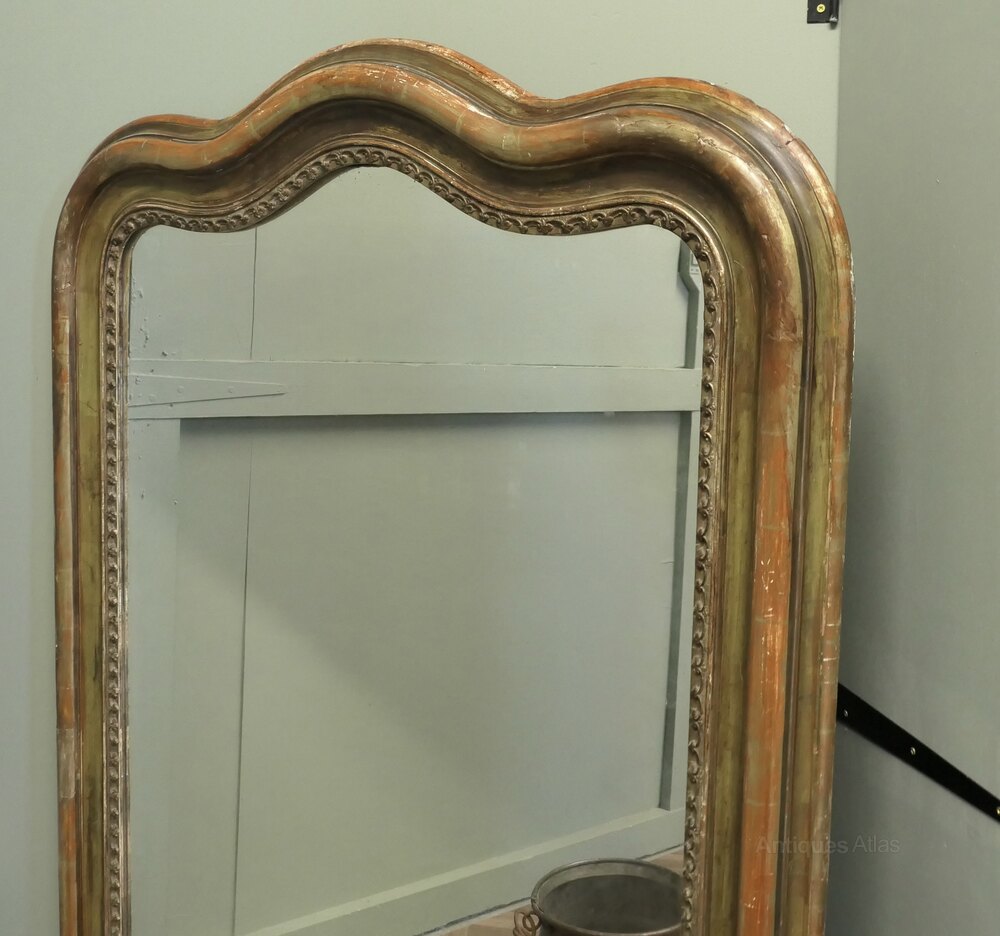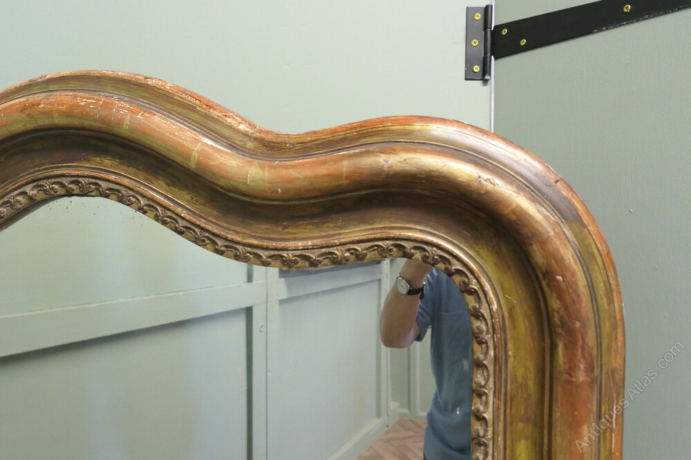This is a Very Large Statement Piece and Genuine 19th Century French Chic Furnishing, the 5” shaped and moulded frame has a serpentine Arch Top and a charming time worn gold finish with the original red oxide showing through it, it is sound and very heavy, the looking glass is also in good condition