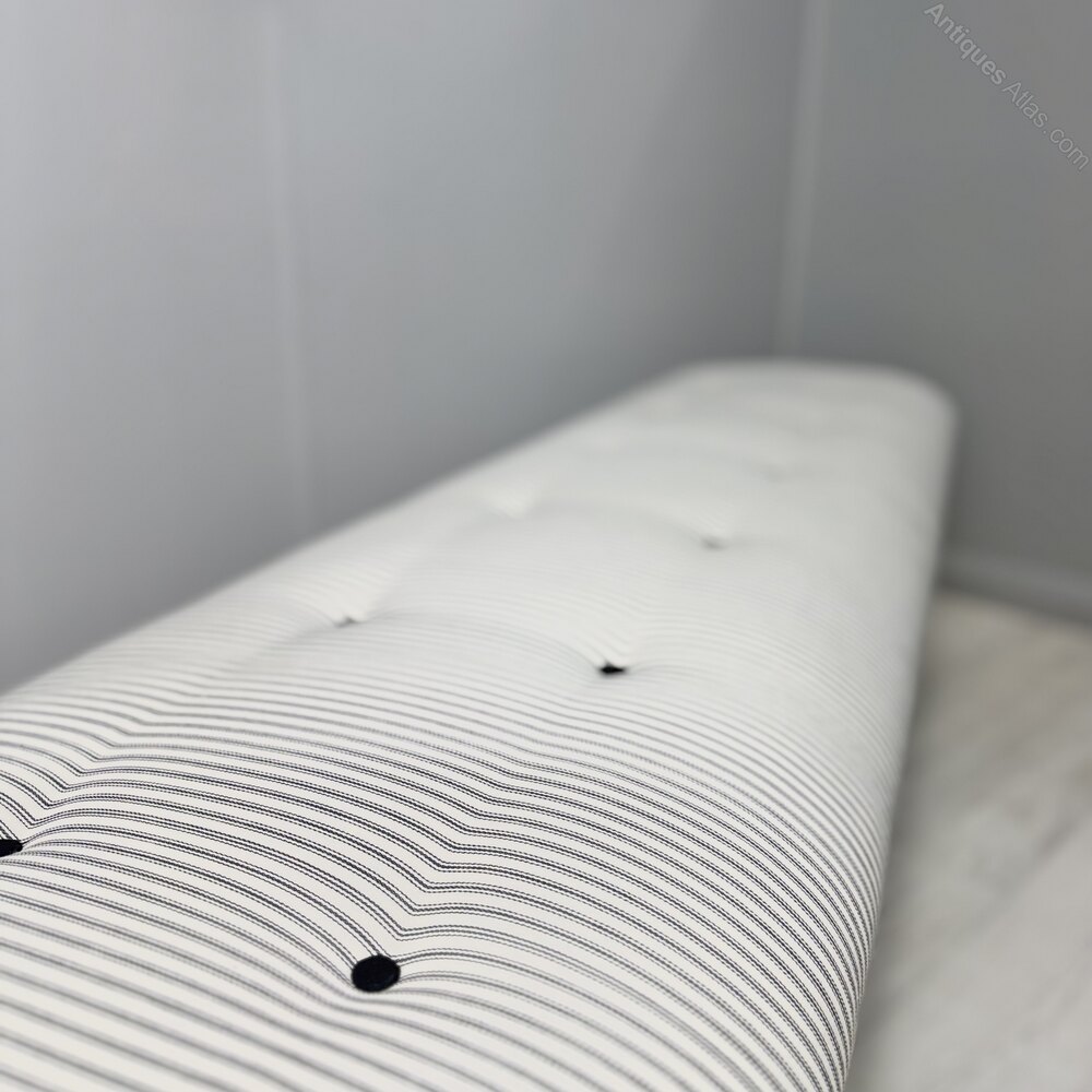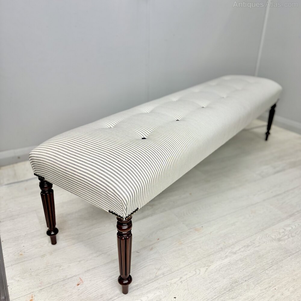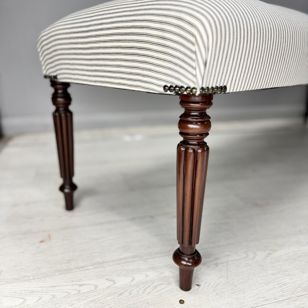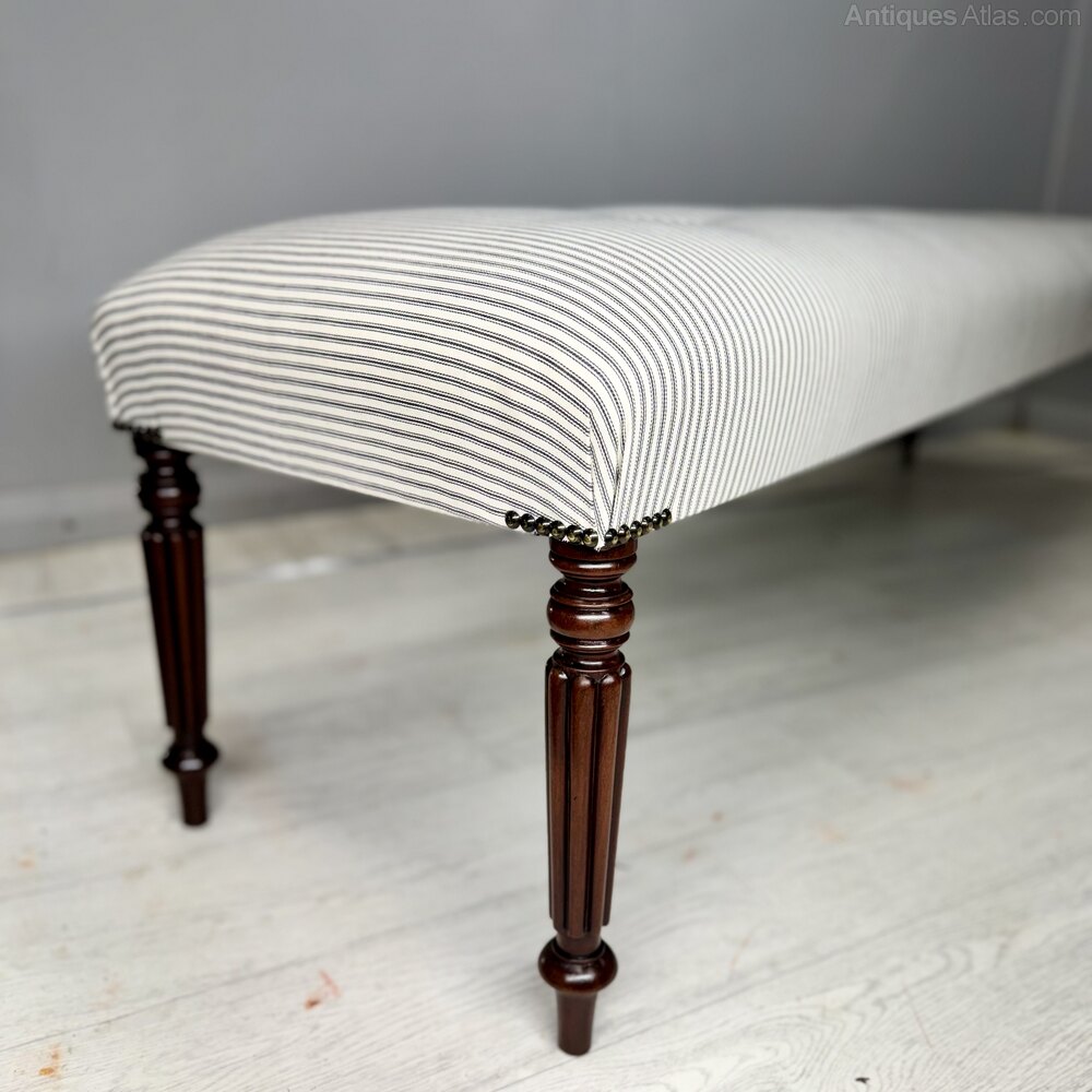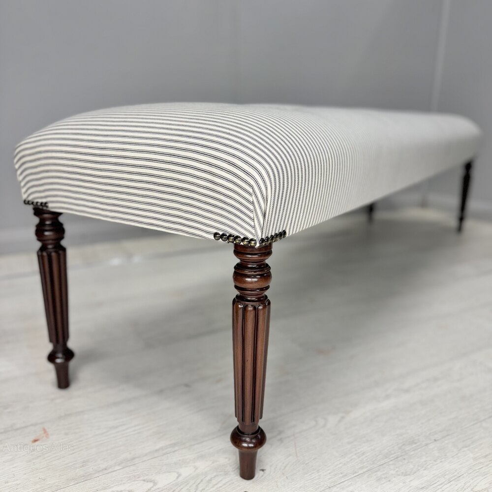 Great size long stool upholstered in a traditional buttoned ticking stripes with antique brass studs to the corners, standing on a beautiful set of Georgian mahogany turned and reeded legs.
