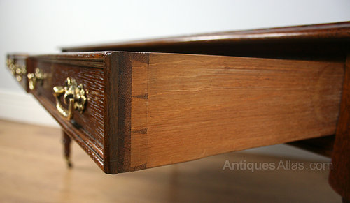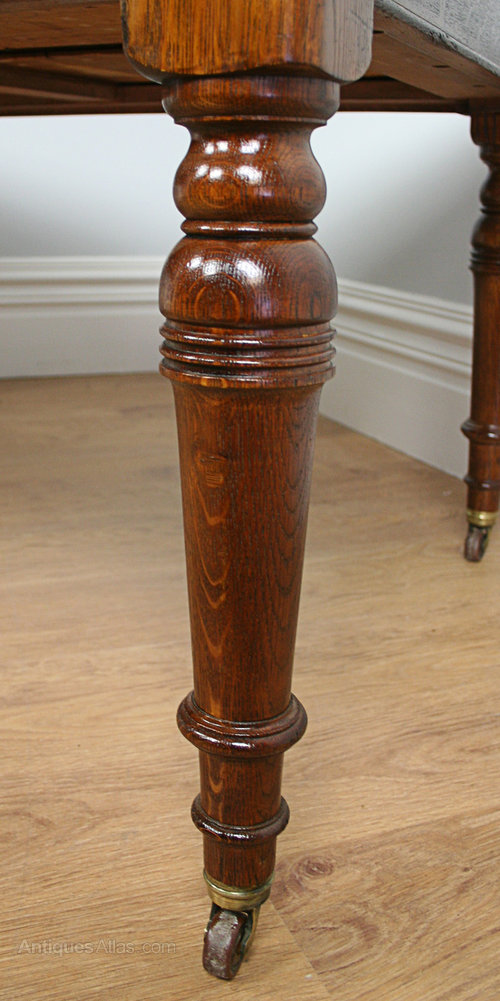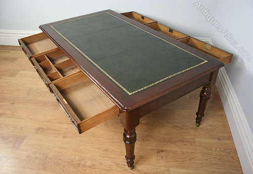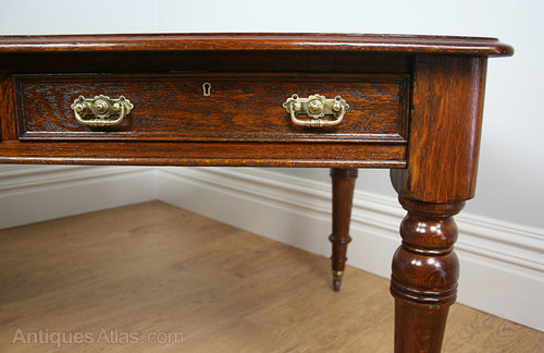 Condition This item is in excellent condition. The tabletop features a lovely oak thumb moulded edge, which surrounds a professionally fitted new three-piece green and gold tool insert leather. There are no splits to the top. The wooden drawers, brass handles, castors and collars are all original. The drawers are in good working order and close flush to the frame. Each drawer features a working lock and key. There are nominal old use marks to the leading edges and top but nothing significant considering the age of the item. Free of woodworm, solid in joint and ready to use.