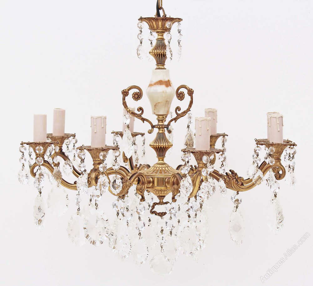 Antique 8 lamp ormolu brass/bronze onyx and crystal chandelier.