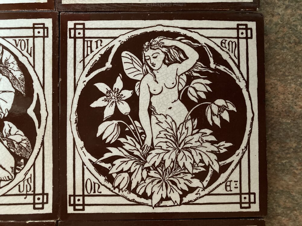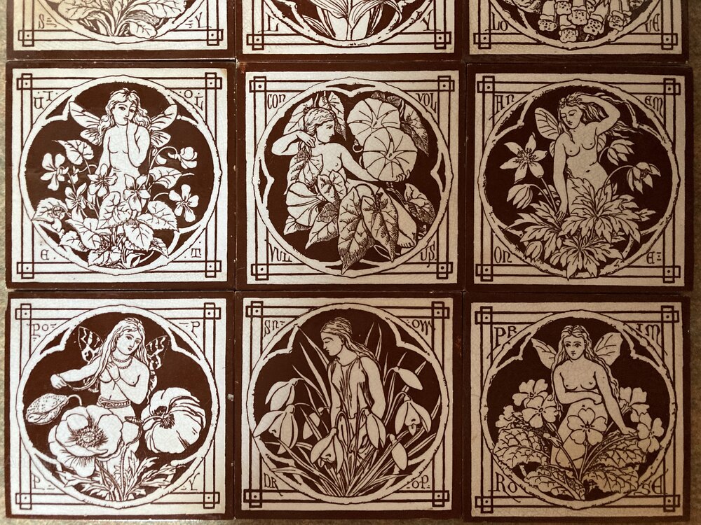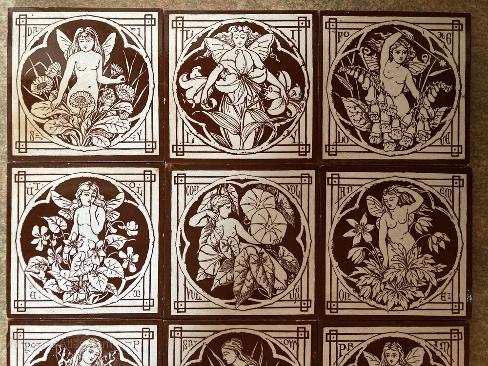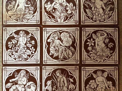 Lovely set of nine Minton arts & crafts tiles from the relatively rare series ‘The Spirits of the Flowers’. Dating to around 1880, the design has been attributed to both John Moyr Smith and C.O. Murray.