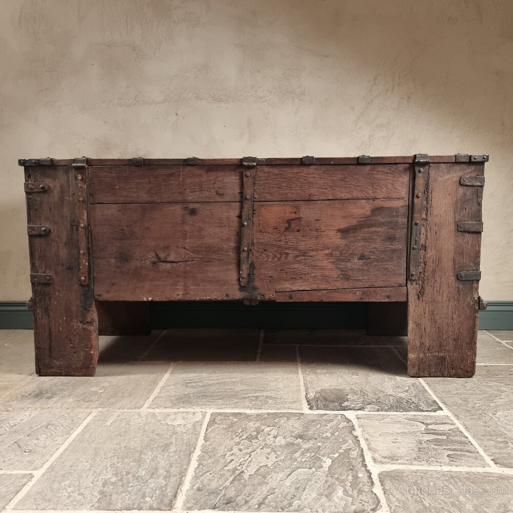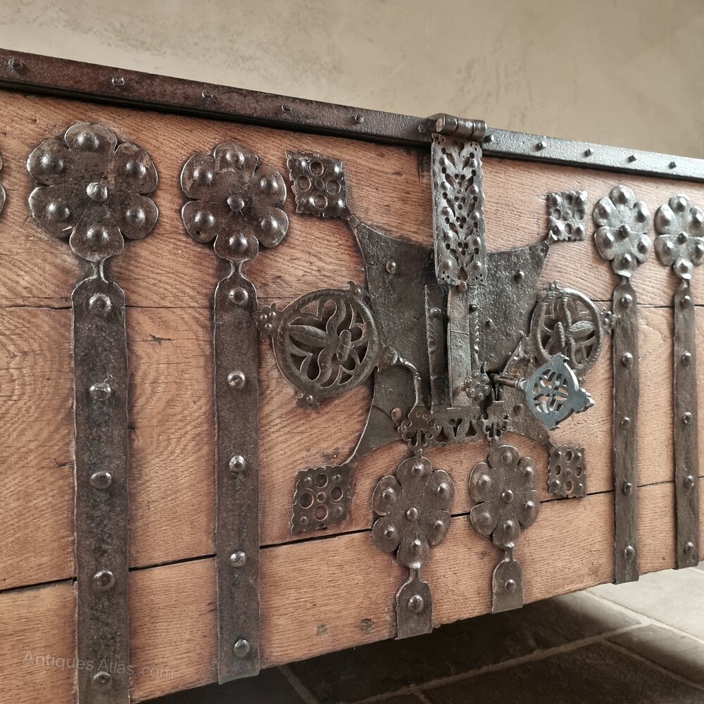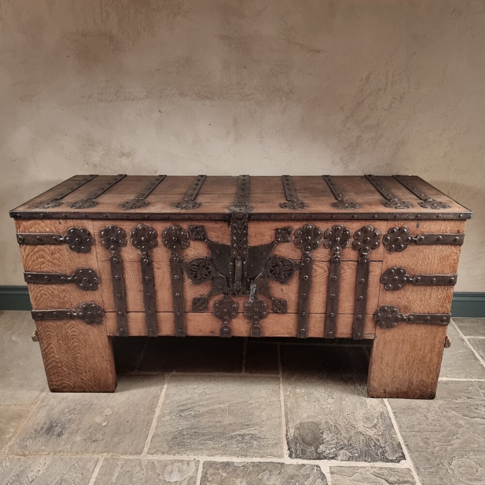 The chest is of oak clamp front constructed with an abundance of original decorative iron straps and ornate lock plate, complete with working lock and key. There is evidence of some old restorations to the ironwork and the timber in a few areas which you expect to see with a piece of this age.