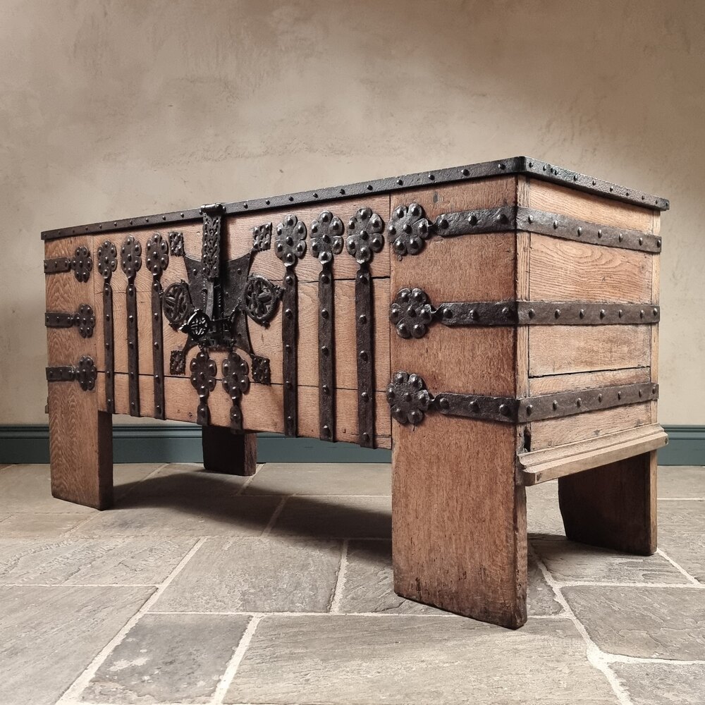 A large 16th century German iron bound coffer attributed to Westphalia, Circa 1500 - 1550.