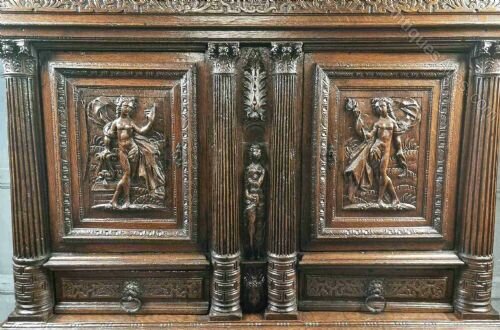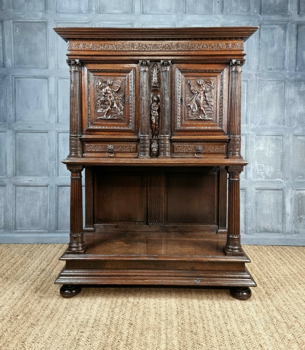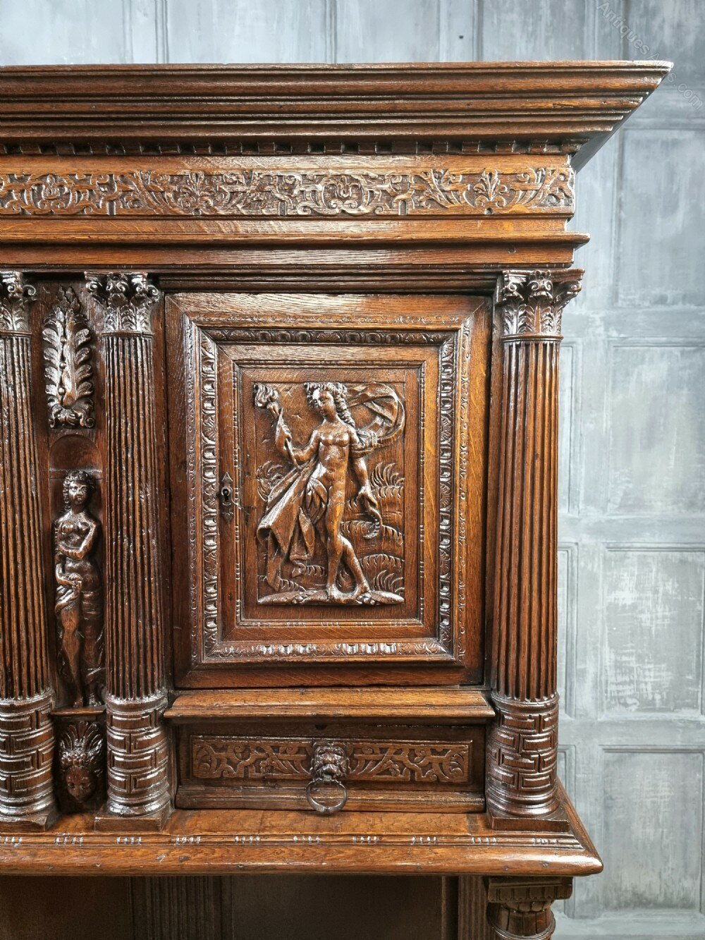 A 17th century carved oak cupboard originating from France, the cupoboard come in two parts for easy mobilty. The cupboard is beautifully carved throughout , with corinthian column supports that give it a rather architectural form. There are two cupboards and two drawers with a pot board below, there are signs of some old restorations, commensurate with age. Unfortunately there is no key for the lock, the right hand door opens and there is an interior shoot bolt for the left door.