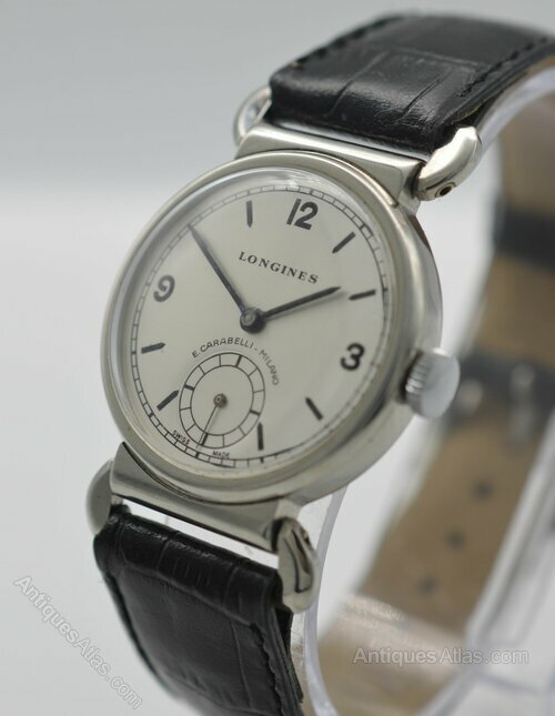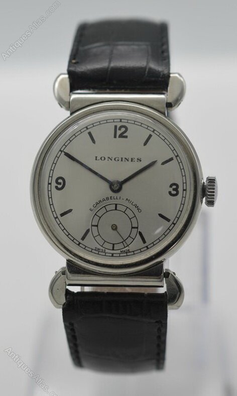 A 1937 Longines stainless steel wristwatch. A silvered dial with a matte finish. Arabic numerals to the quarters, with 'pencil' markers to the rest. Surrounded by an outer minute track. A subsidiary seconds dial to 6 o'clock. Signed by retailers 'E Carabelli - Milano'.