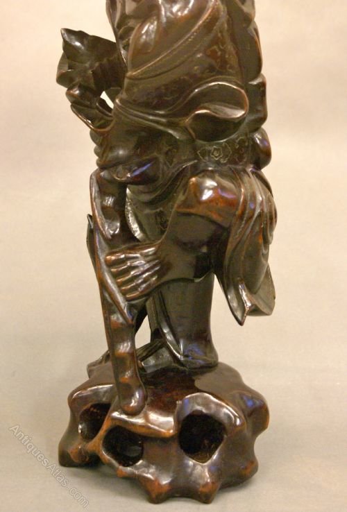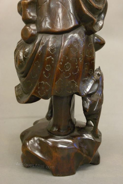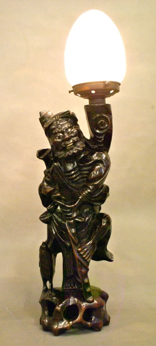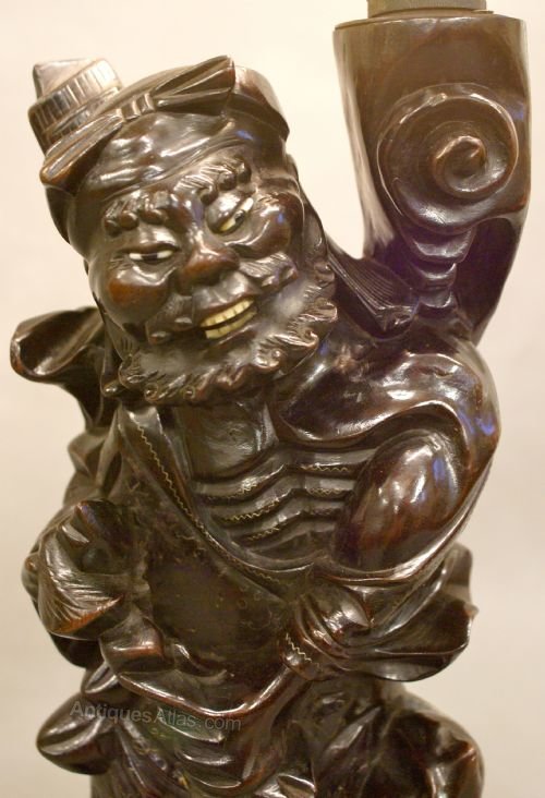 This beautifully carved root figure has an incredible amount of detail, from the bone inlaid eyes and teeth to the fine pewter line that has been used to decorate much of the figures clothing. Circa 1880 (lamp conversion later) 610 mm high.