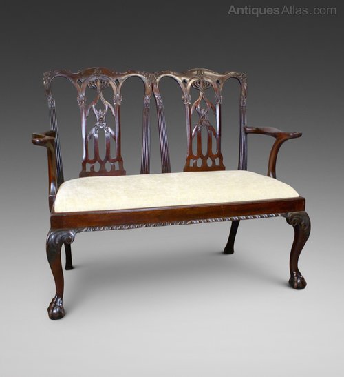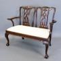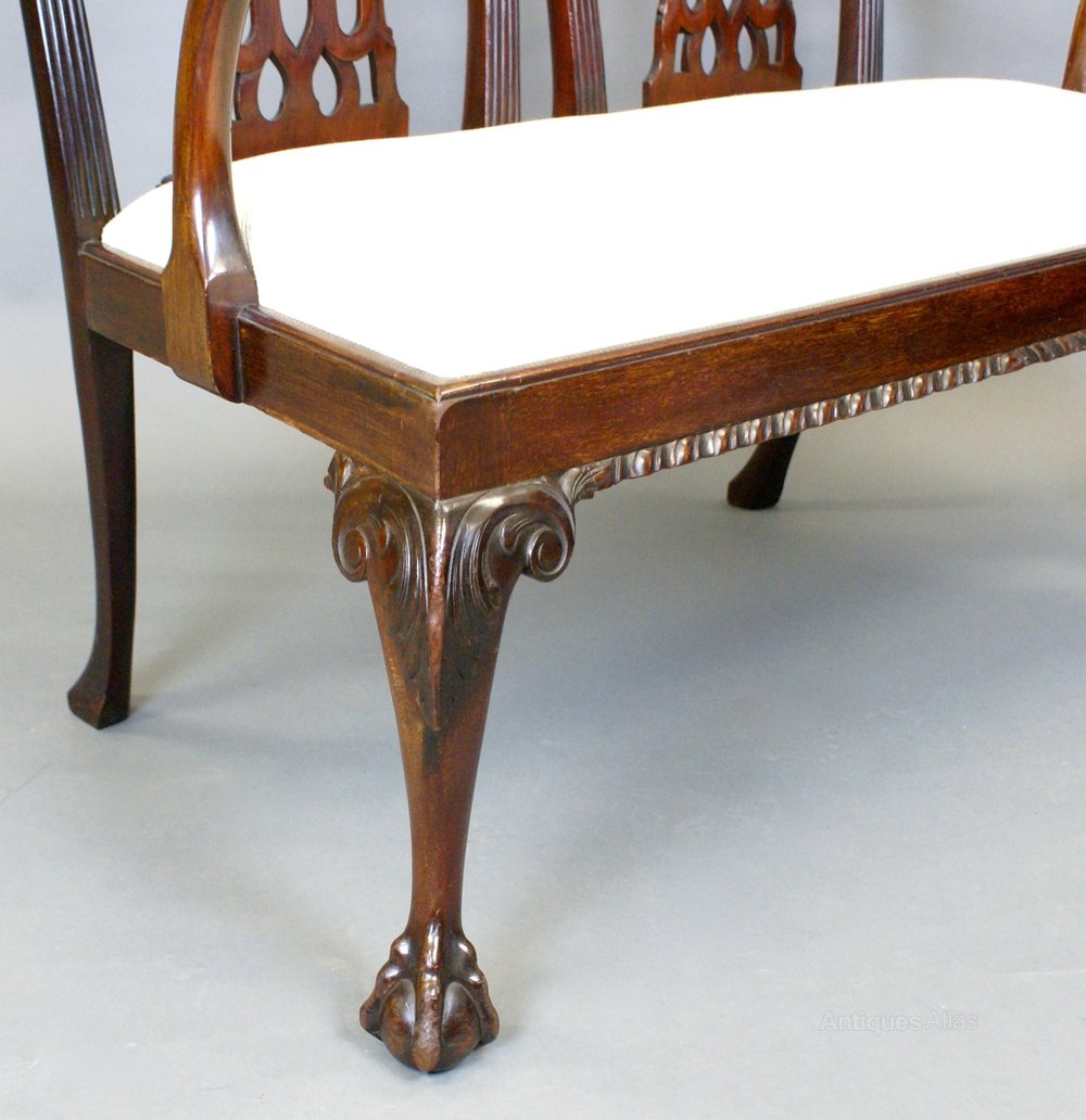 A Chippendale Revival "chair-back" sofa, in dense mahogany and beautifully carved, this sofa stands on cabriole legs with carved knees and ball and claw feet. It also has out-swept arms and the back features pierced and foliate carved designs. In good condition and recently reupholstered. 1000mm high, 1220mm wide, 640mm deep and 480mm seat height. English. Circa 1900.