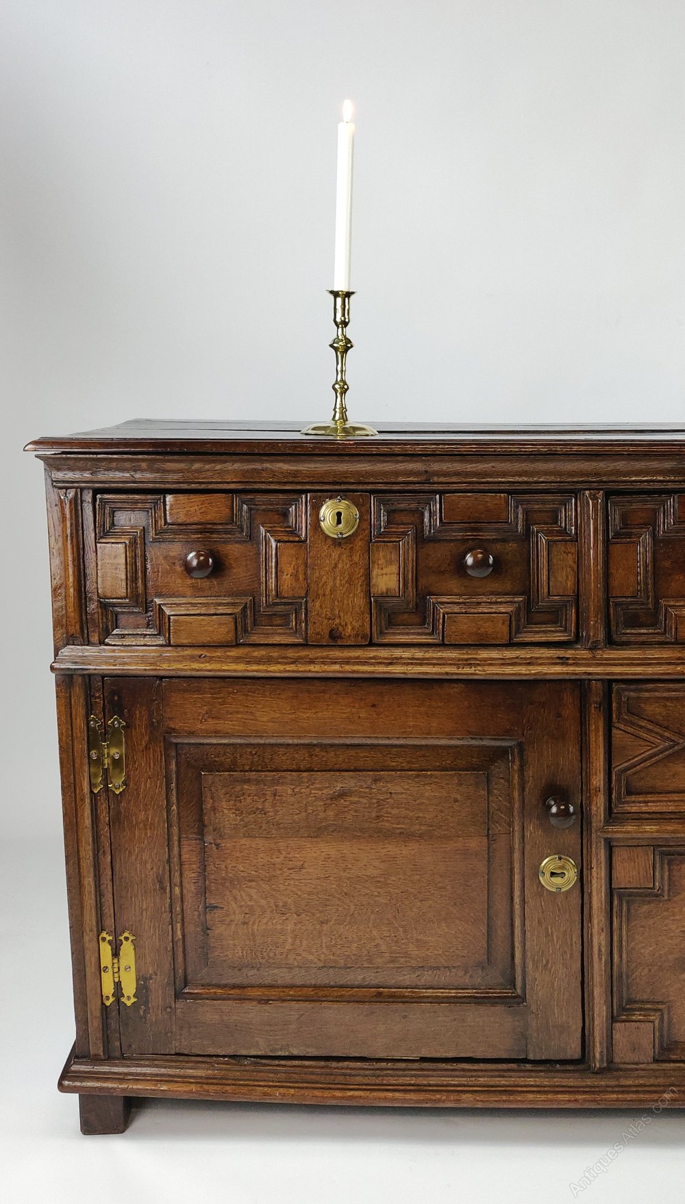 A fabulous late 17th century enclosed dresser base ,consisting of five geometric drawers in a T-shaped formation with the bottom one being a false drawer and a pair of cupboards either side. The drawers have heavy mouldings which make up wonderful geometric designs and the doors being more simply refined with a fielded panels. All drawers and doors retain their original turned knobs and brass escutcheons, the brass hinges on the doors are however later replacements as this is a common feature with dressers and cupboards of this period.