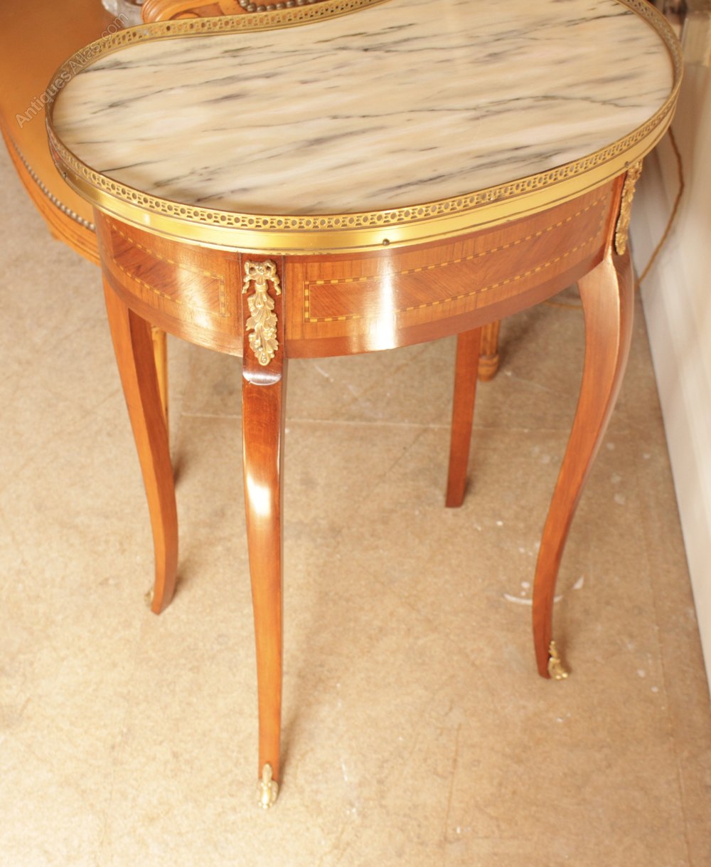 A french walnut kidney shape marble top table with brass gallery and single drawer finishing with four cabriole legs.