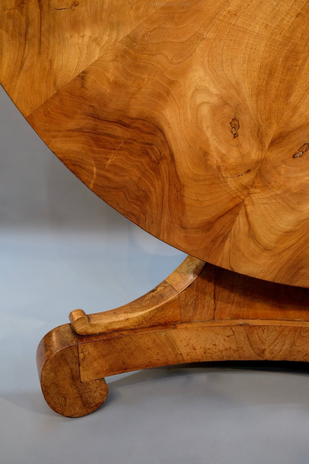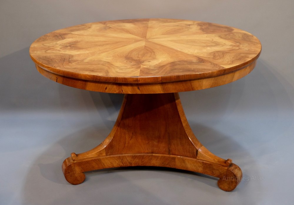 A Fine quality 19th C French Walnut Centre table. The Tip up top with wonderful Radiating Veneers and sitting on a Triform Walnut base.