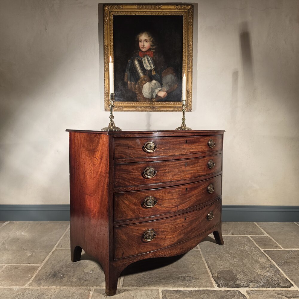 A Georgian mahogany bow front chest of drawers of excellent quality and having superb colour and patination. The chest has period but later replaced brass handles and some minor restorations, but is as good as the day it was made, perfect for any bedroom.