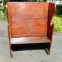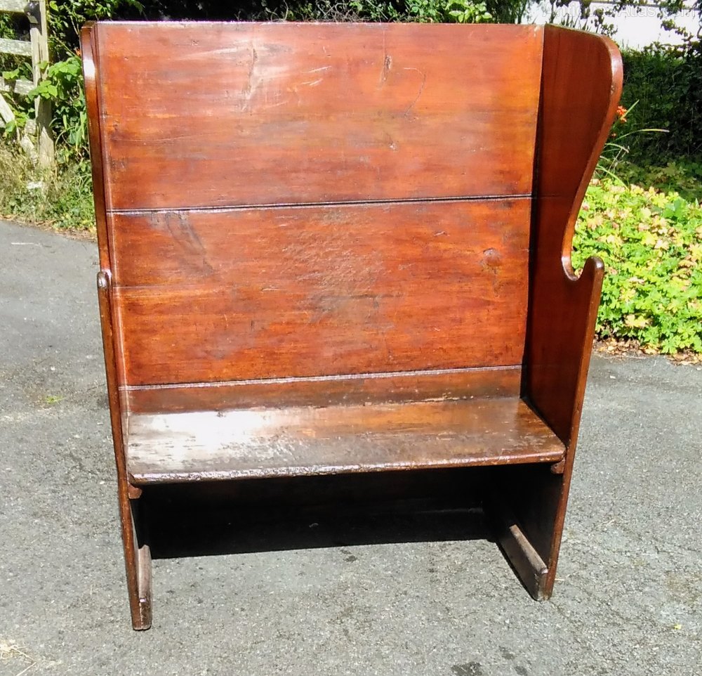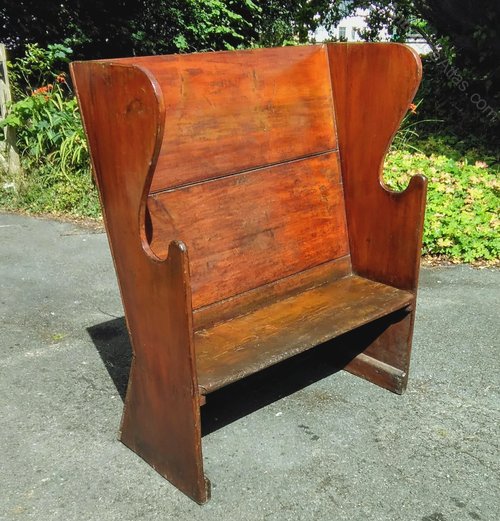 A lovely early nineteenth century pine settle, most unusually with an angled back. That is so much more comfortable than the straight backs normally seen on this type of settle. From the seat down the back angles out sharply to counteract the fact that two people might be leaning back in the seat and without it the thing would topple over backwards. The shape also means that it can be treated as a freestanding piece of antique furniture without needing a wall behind it, it can stand safely anywhere in a room.