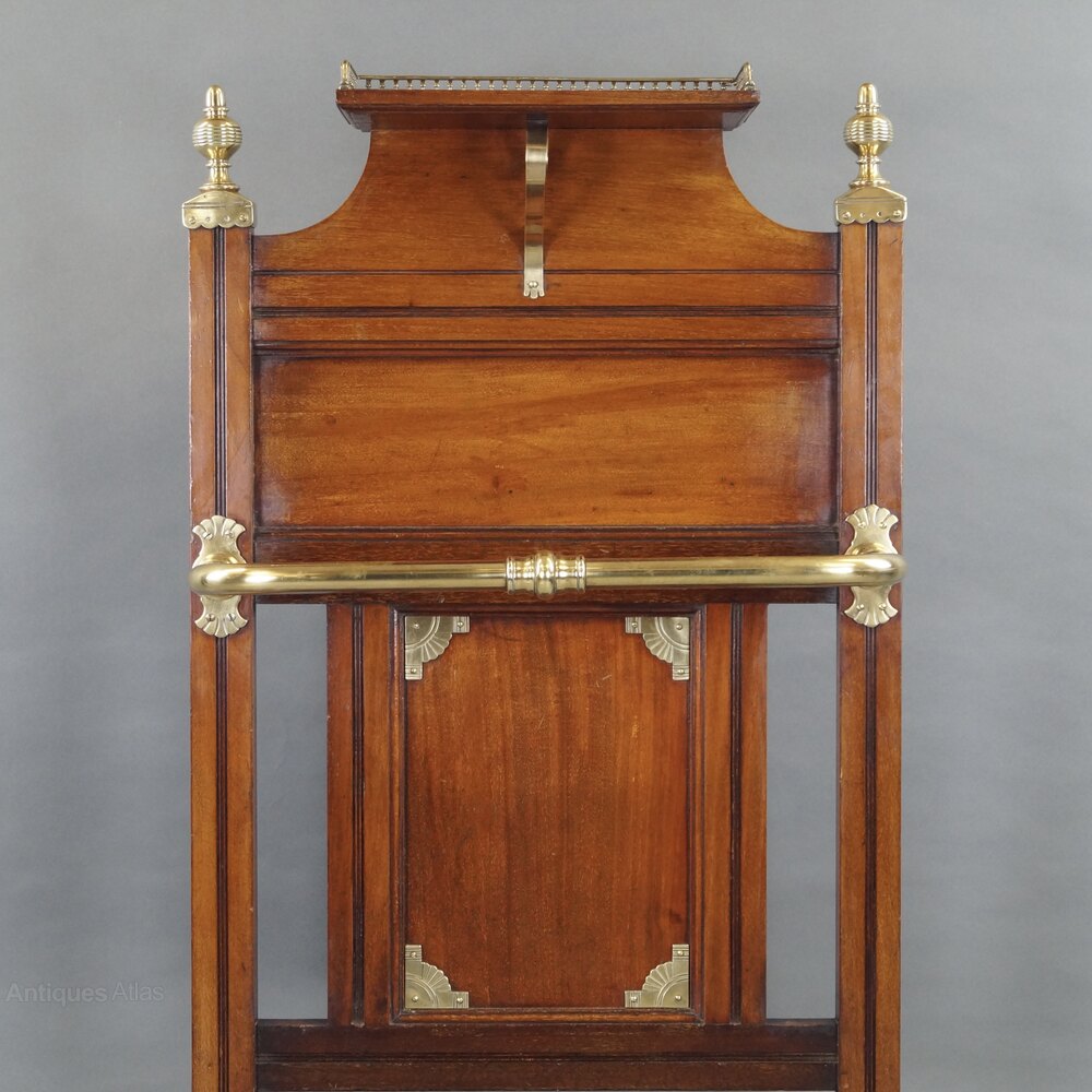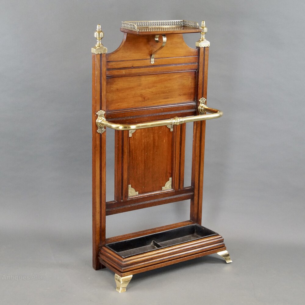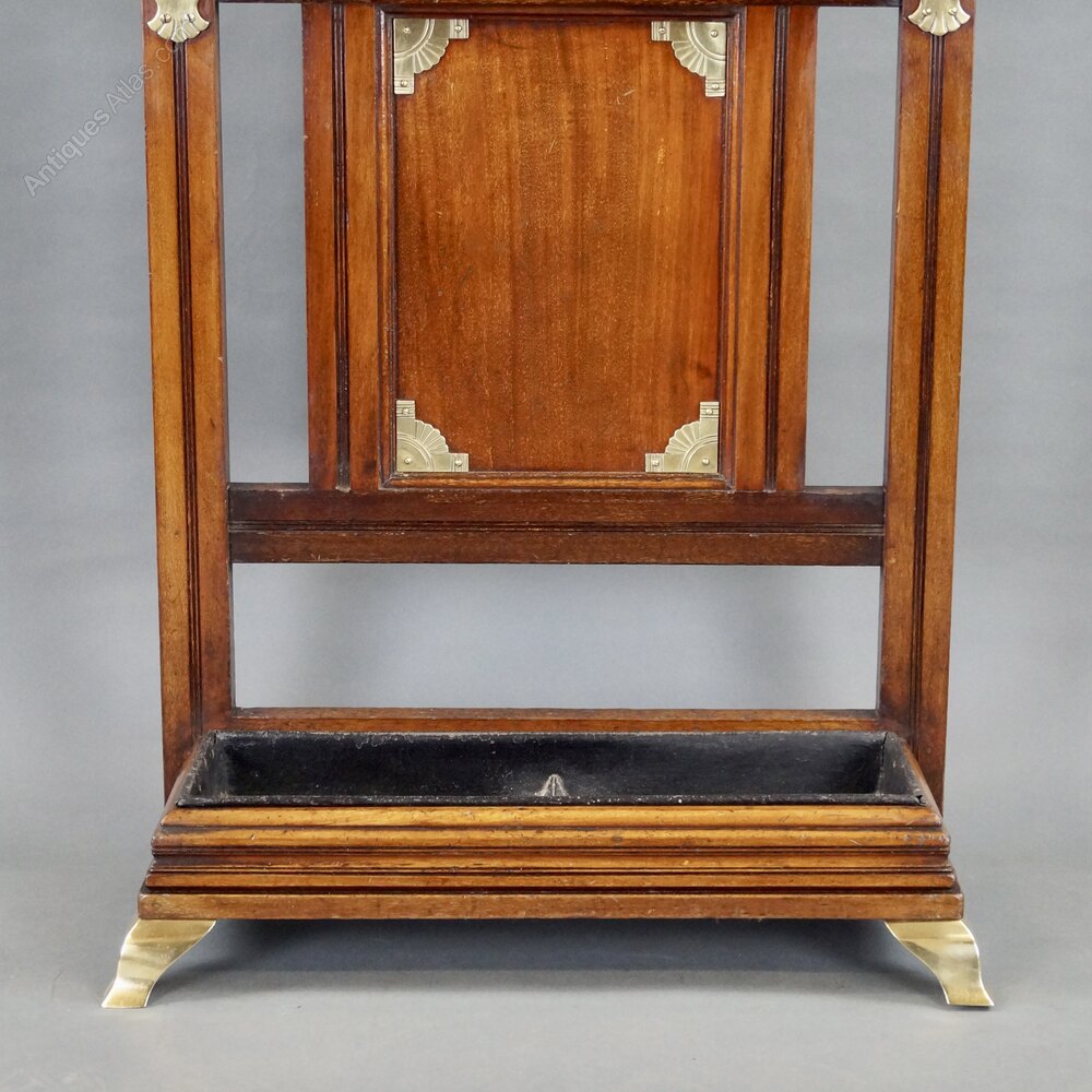 A Walnut and brass mounted stick stand by James Shoolbred and Co. Having raised three-quarter pierced gallery above a paneled back with turned brass finials and stick/umbrella holder to the molded base supporting a drip pan. All raised up on brass bracket feet. 1030mm high, 560mm wide and 260mm deep. English. Circa 1880.