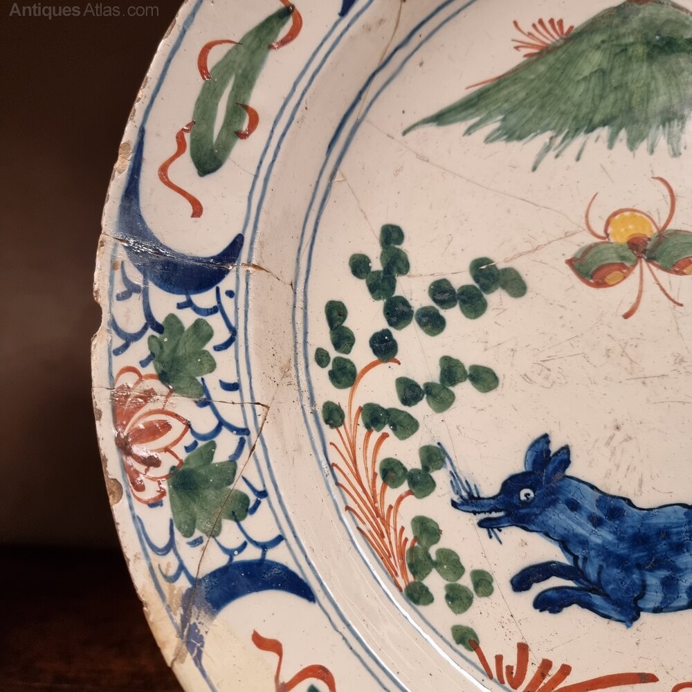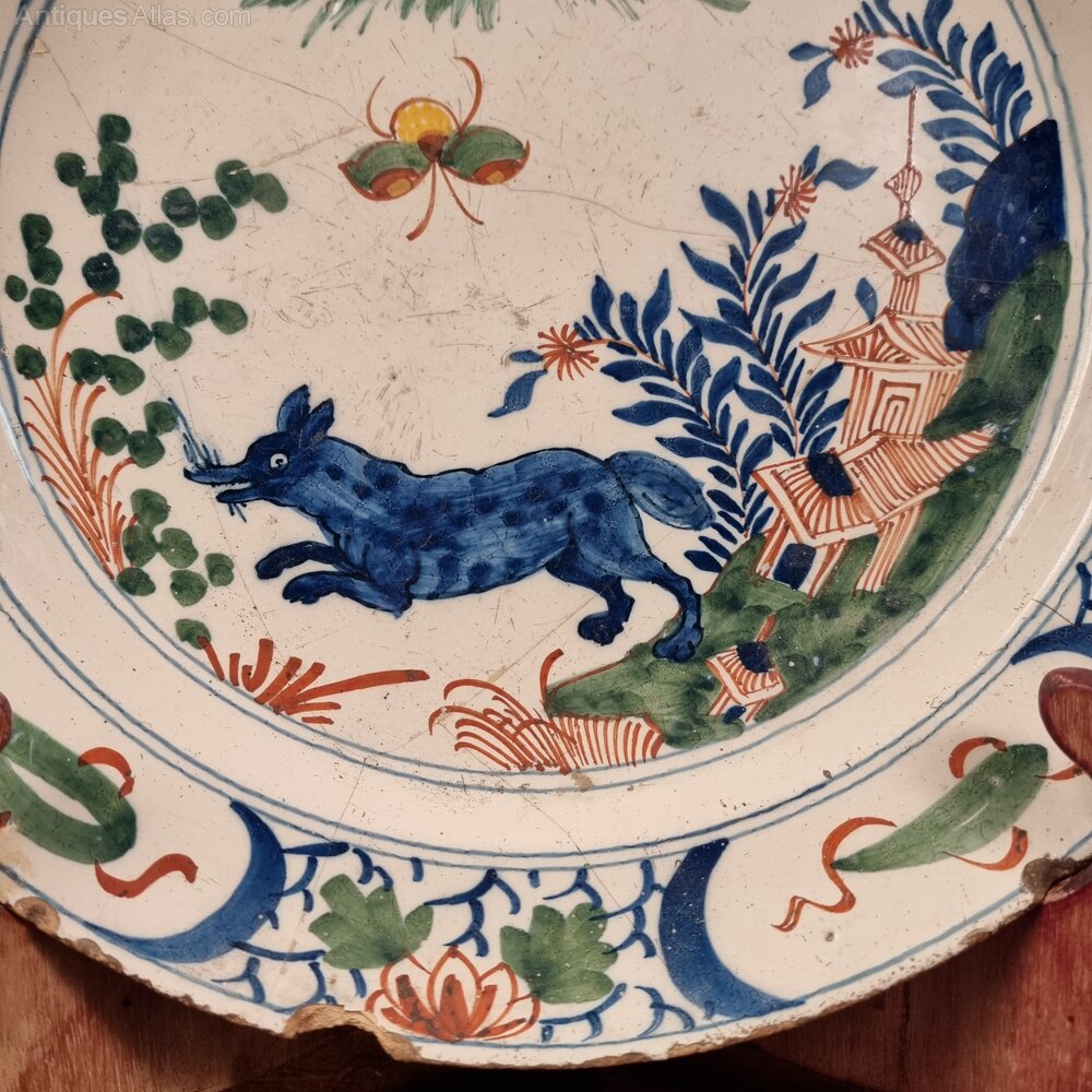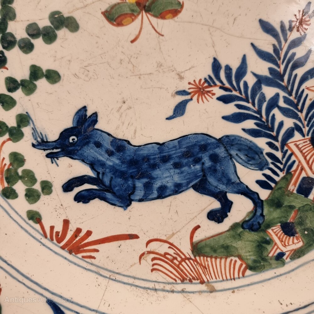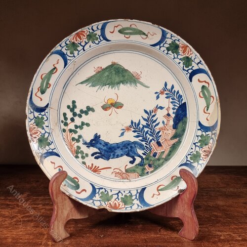 An unusual large 17th century delft polychrome plate depicting a running fox, with some oriental influences.