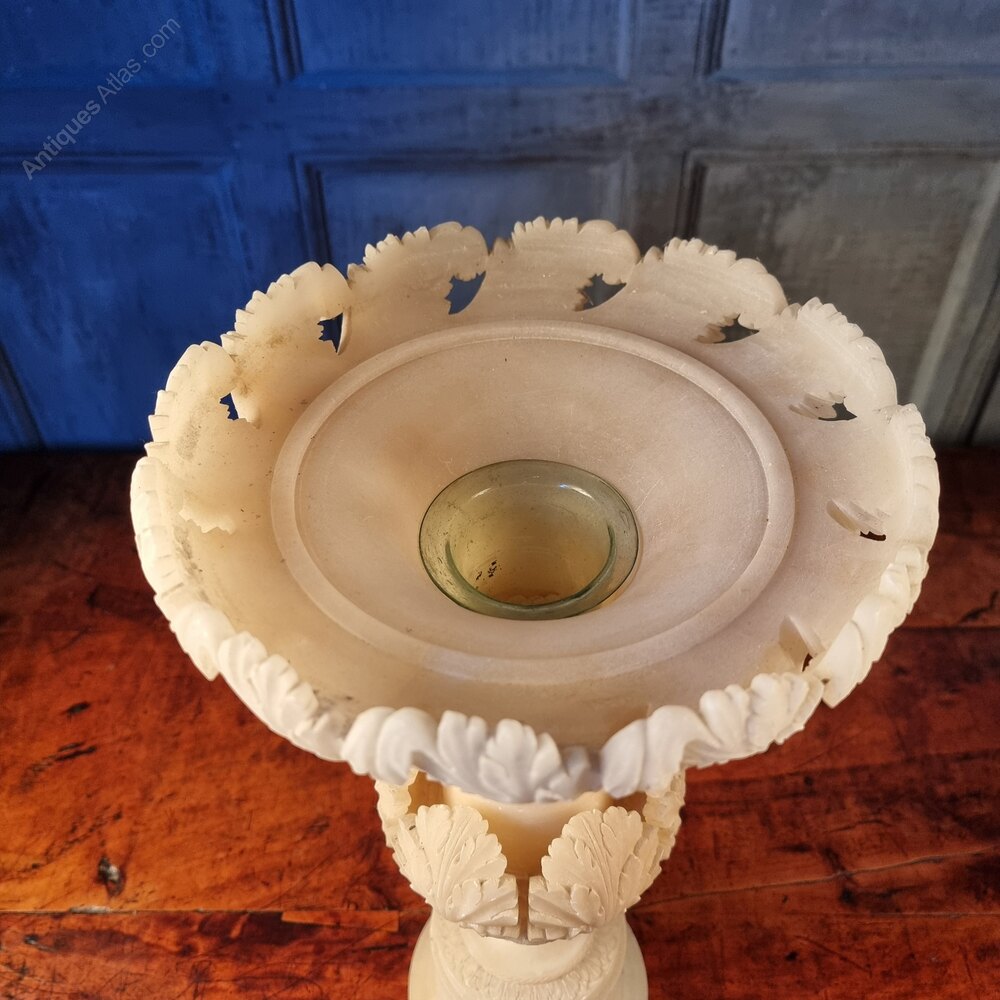 A large 19th century carved alabaster urn with glass inset for flower displays. The urn comes in three section and is very finely and beautifully carved, there is one piece of alabaster missing commensurate with age, but other than that its in excellent condition.