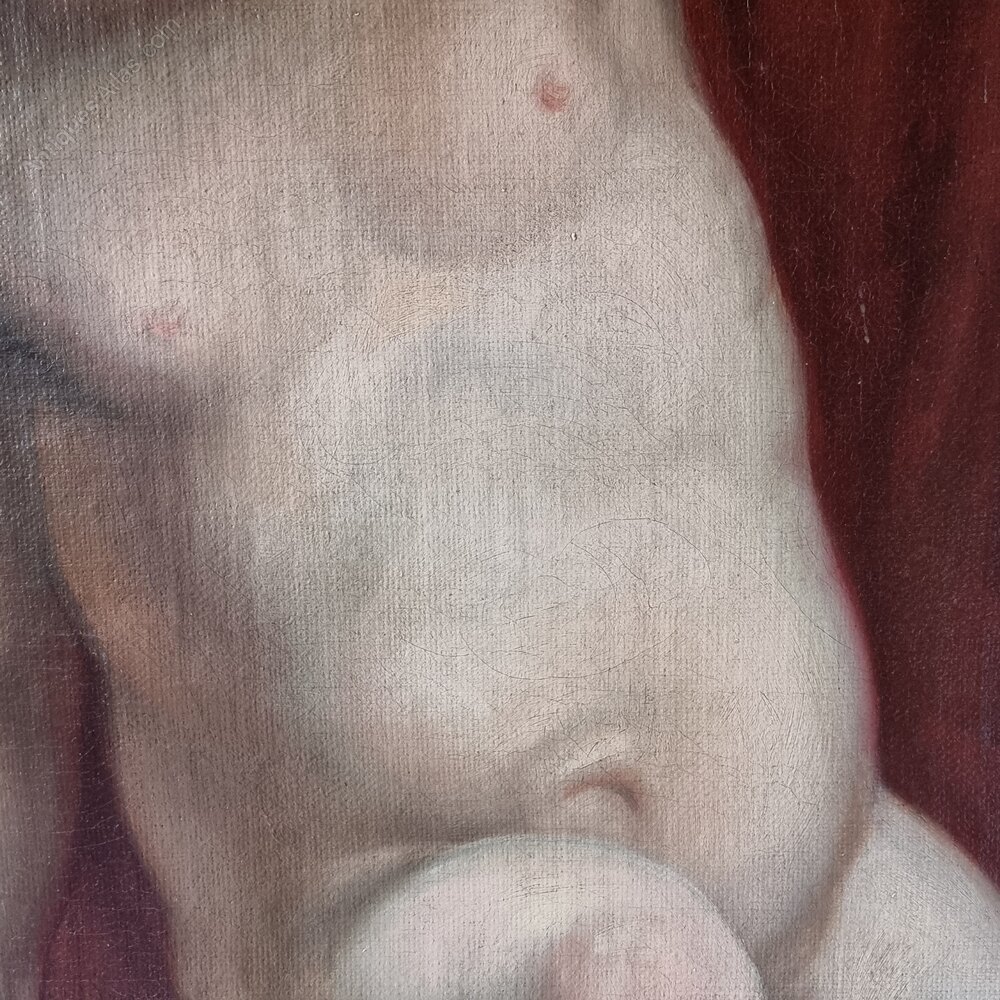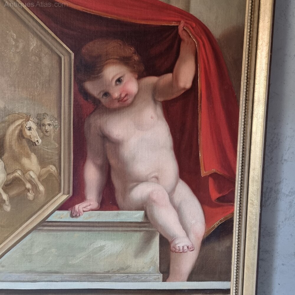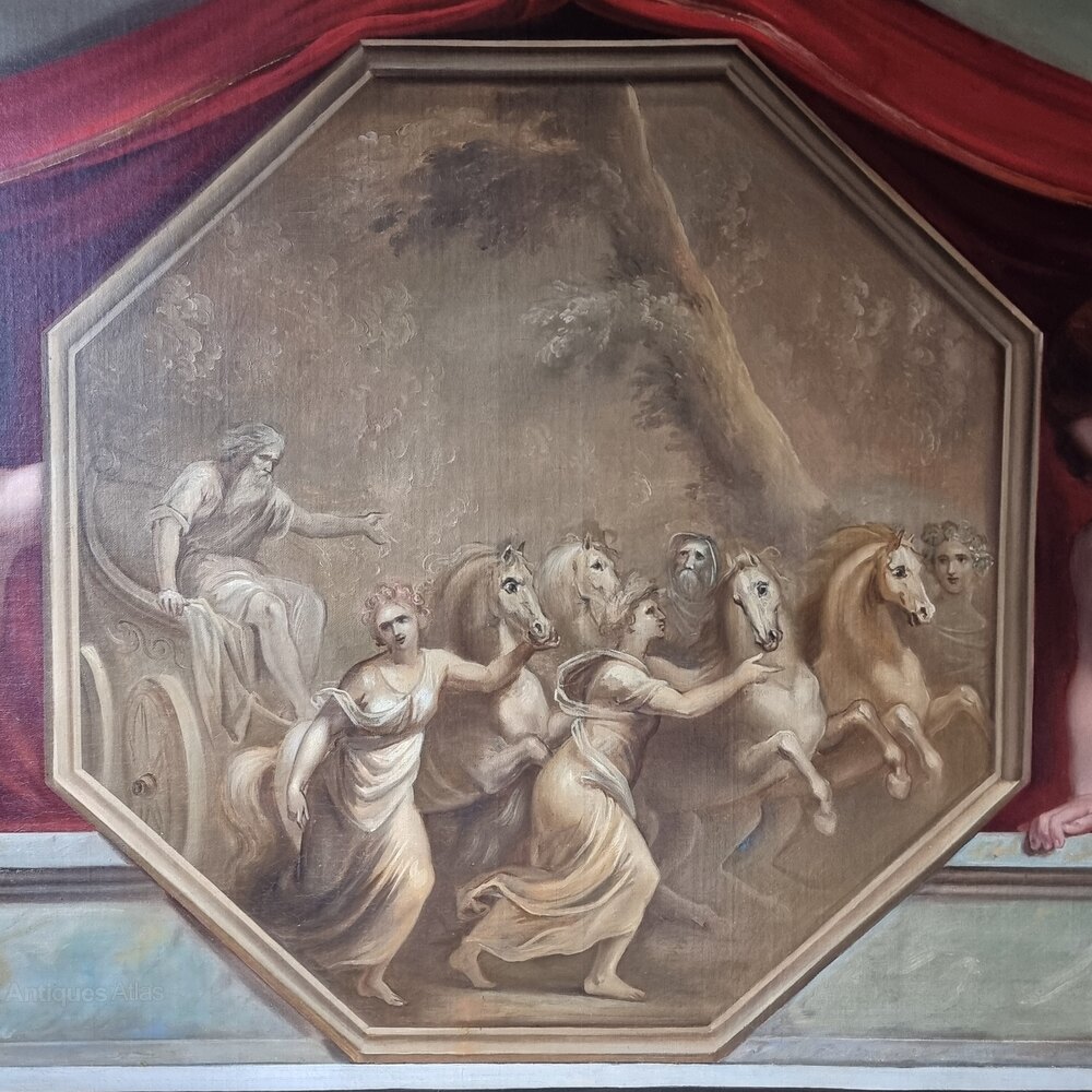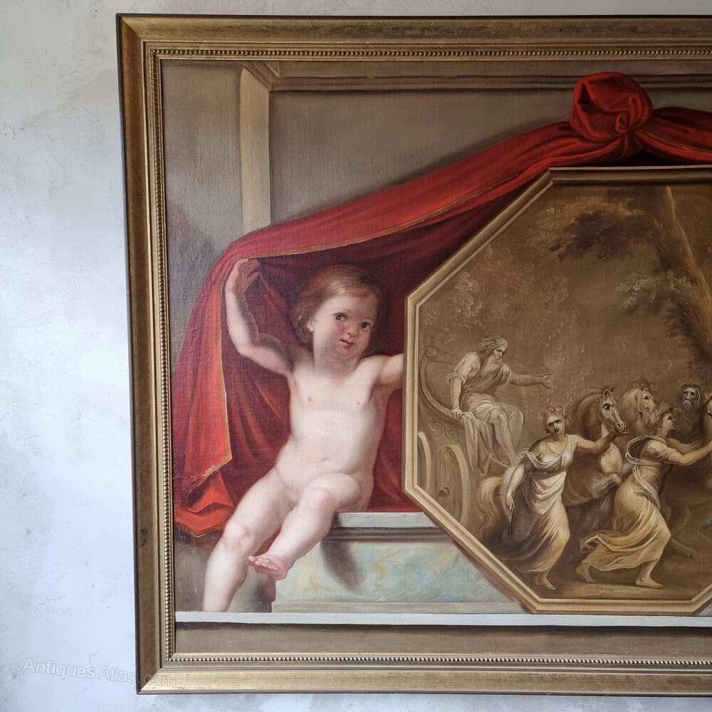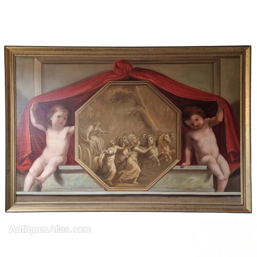 A large decorative 19th century European or English classical oil on canvas and set within a later gilt frame. The painting depicts a pair of cherubs sat upon a marble mantle with each holding up a red curtain, in between them is a octagonal scene most likely depicting Apollo in his chariot pulled by his four horses Pyrois , Aethon, Phlegon and Eous. The hooded man is possibly Hephaestus, and the women most likely Helios sister Eos, Hyacinthus and Marpessa both Apollos loves. The picture is beautifully painted and in excellent condition, the surface has some age related craquelure and one tiny restoration to one of the horses. On the back is some old chalk writing , Sainsbury 104.