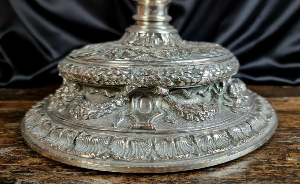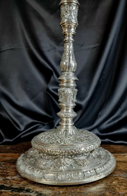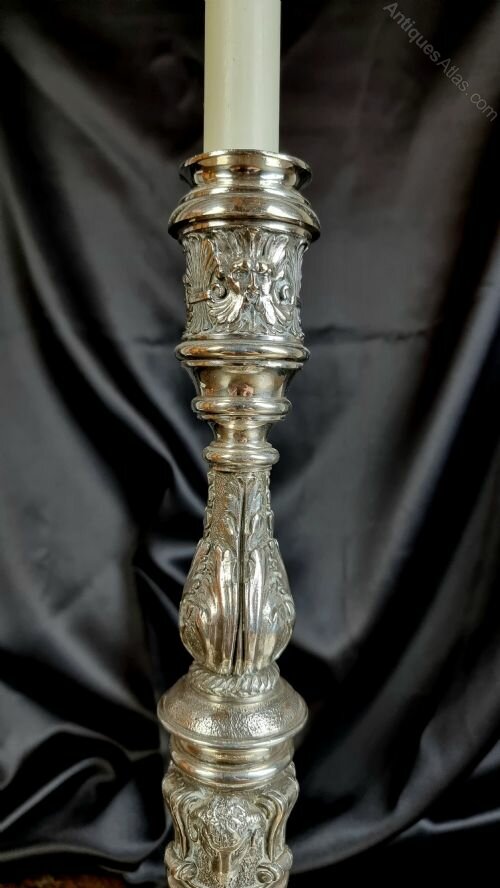 A large 19th century renaissance revival silver plated candlestick made by Elkington, from the department of art and science. A superbly detailed and high quality candlestick with pretty much all its original silver plate intact, copied from a 16th century renaissance candlestick, by Elkington.