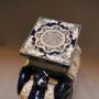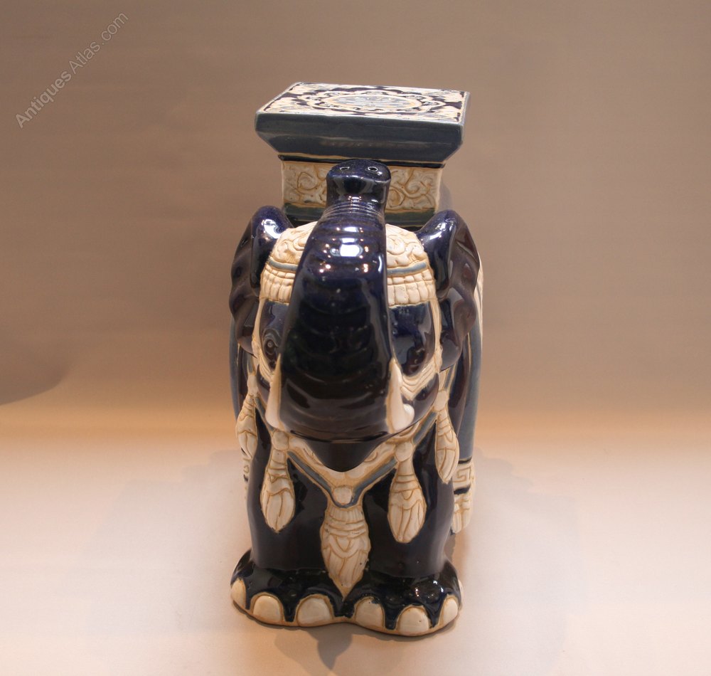 A large ceramic Elephant plant stand. It has a platform for the plant pot. The elephant is dark blue, with pale blue and cream decoration on the headdress and blanket. It could be used as an unusual side table.