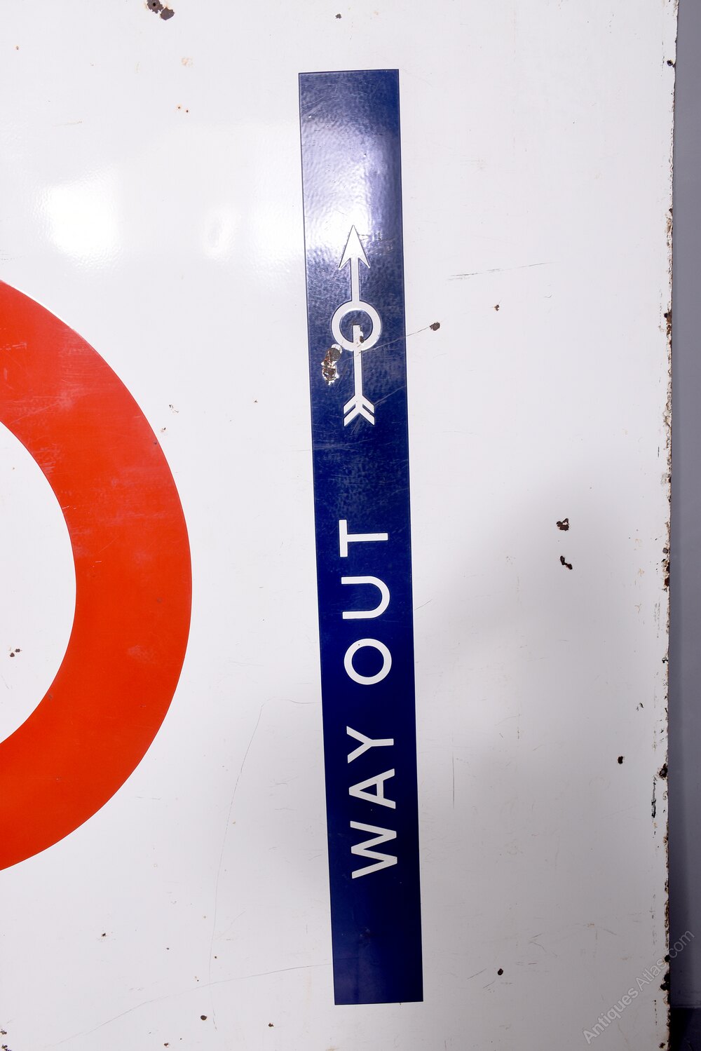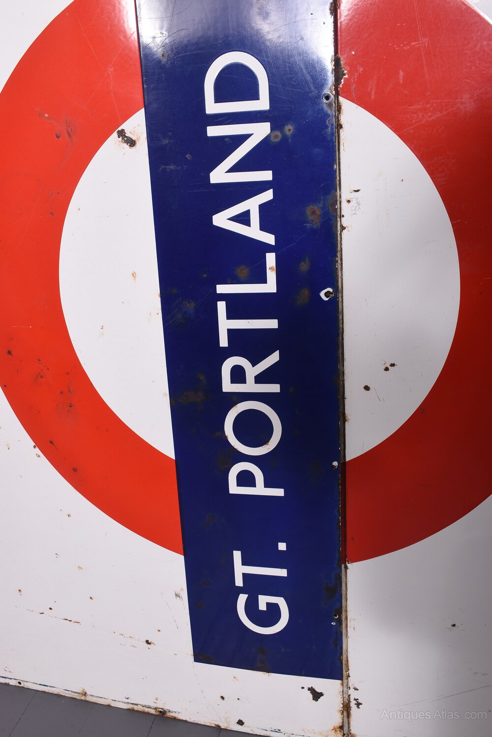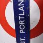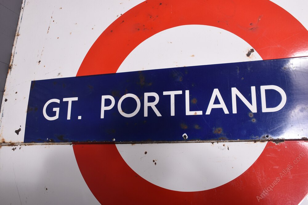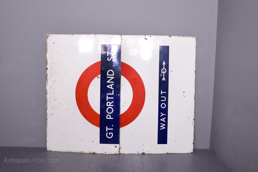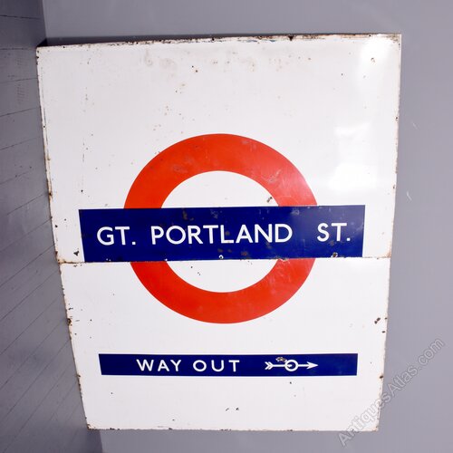 Circa 1930. A large two part coloured enamel sign for ‘Great Portland Street’ tube station in London. The white enamel sign with the classic London circle with ‘Great Portland Street’ on the front in blue. The bottom section in blue as stenciled ‘way out’ with an arrow. POSTSCRIPT: Great Portland Street station in London has had its name changed several times since it was opened in 1863