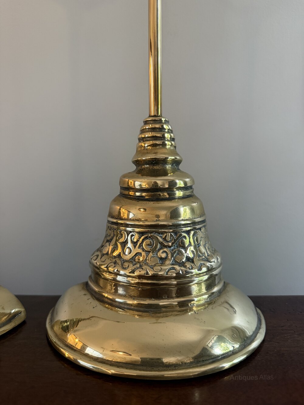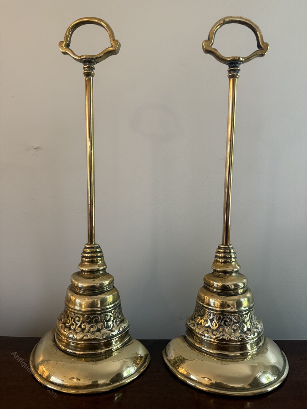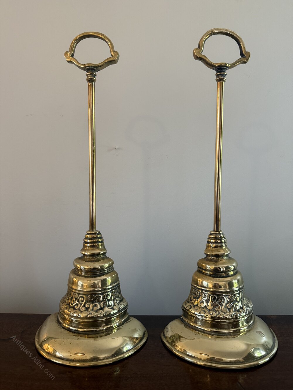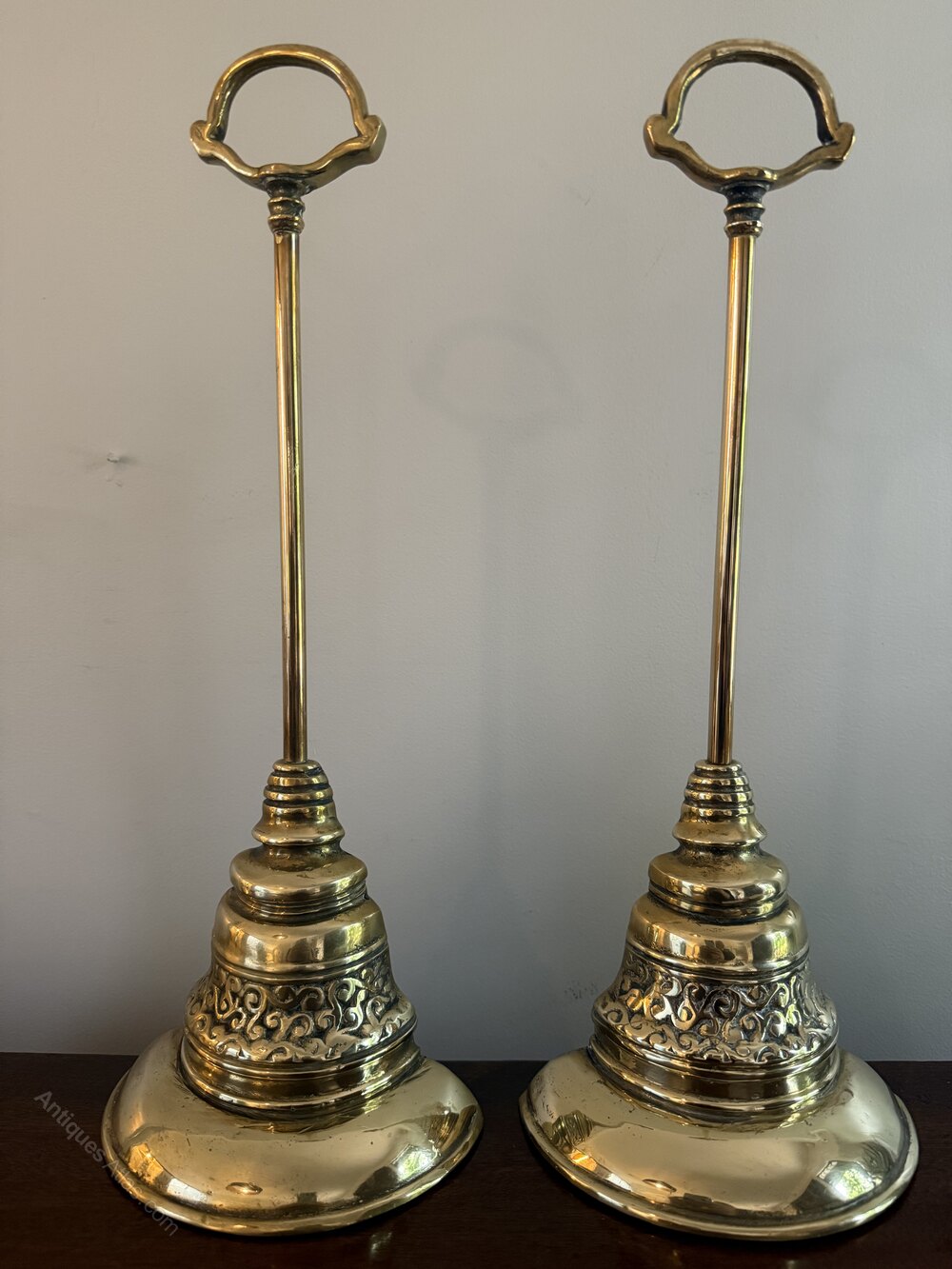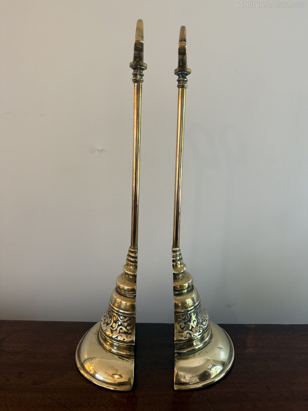 A matched pair of polished brass doorstops or door porters, both in a wonderful antique condition. This elegant design is likely crafted by William Tonks and Sons who supplied brassware to Liberty London between 1852 and 1889.