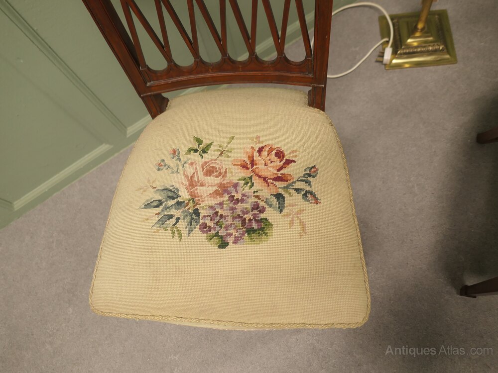A beautiful pair of Arts and Crafts naturalistic design chairs, the chair backs have a carved lattice formation, the seats are upholstered with a petite point tapestry of flowers, in wool
