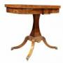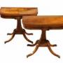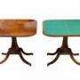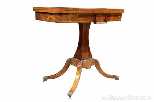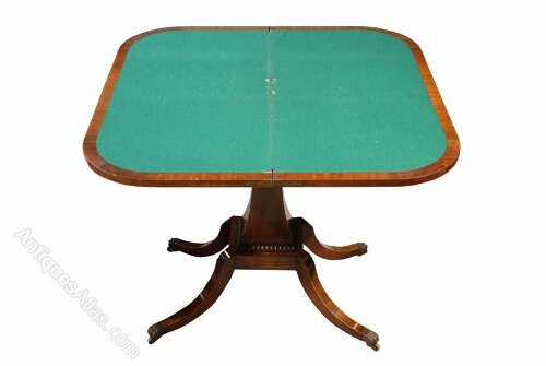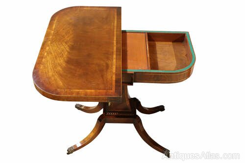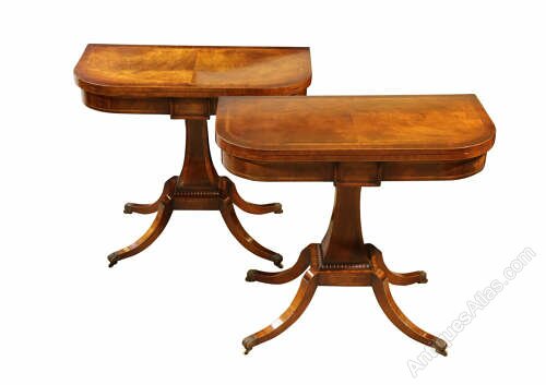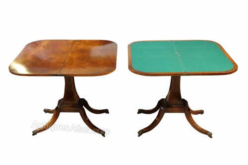 This is a fabulous pair of Sheraton Revival card and tea tables, crafted in the early 20th century. Made from richly figured mahogany with intricate satinwood inlays, these tables offer both function and refinement. Each table features a fold-over top that opens to reveal either a polished mahogany surface or a green baize-lined interior, ideal for card games or afternoon tea. The pedestal bases with quadruple splayed legs and original brass castors reflect classic Sheraton styling and superior craftsmanship.