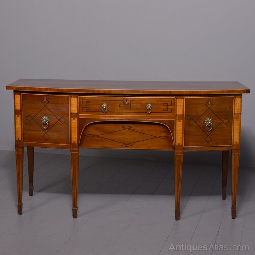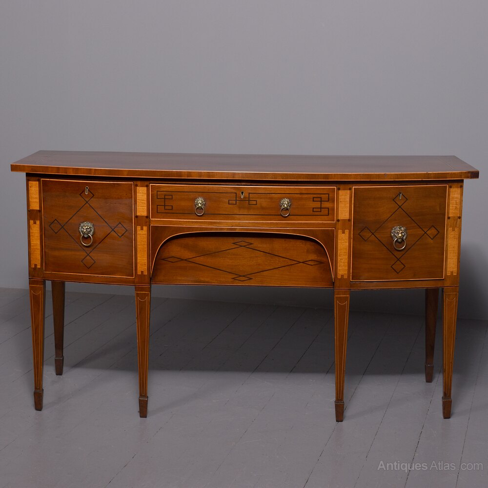 Circa 1790. A large stylish bow fronted mahogany and inlaid George III sideboard, the top with fine figured mahogany with triple string inlay, broad banding and a boxwood banded fore edge, the front with a configuration of one curved drawer with stylish geometric inlay with a pair of brass lion mask handles with ring pulls through the mouth, beneath this there is a drawer in the frieze with inlaid quarter sections and geometric inlay, flanked by a full length drawer on the right fitted for wine bottles, with large cast brass lion mask handles, the other side has a faux drawer which opens to reveal a cupboard with uninterrupted space with similar handle and inlay, all resting on six stout legs with the ones at the front with satinwood and various inlaid panels and inlay, the tops of the legs with inverted arches and finishing on extended toes, all with great colour and patination, in excellent condition.
