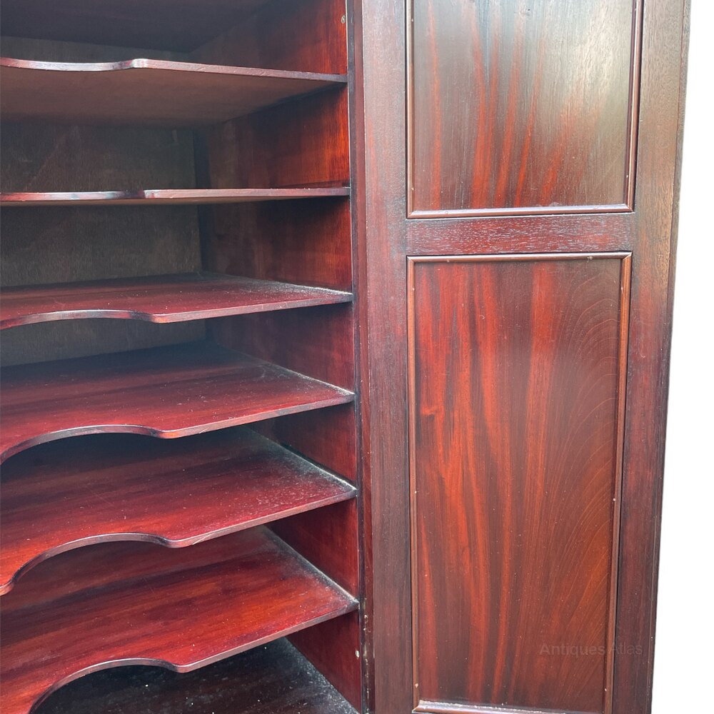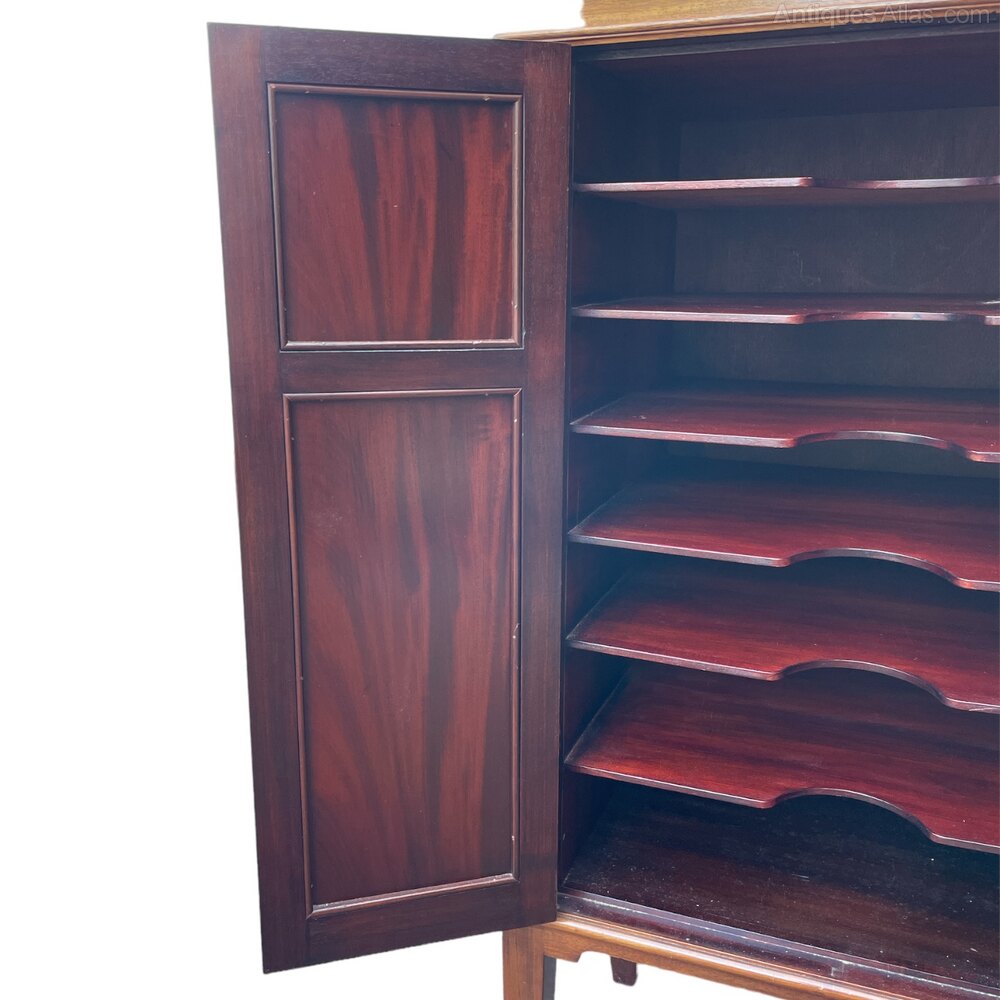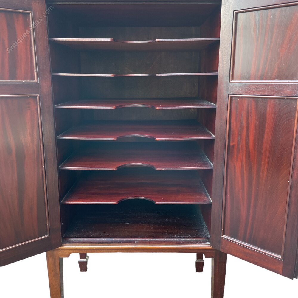 A good quality mahogany music cabinet with seven compartments, brass drop handles, moulded edges to top, sides and doors, the cabinet was hand made by Edwin Gabbitas a violin maker in England 53cm w 39cm D 102 H