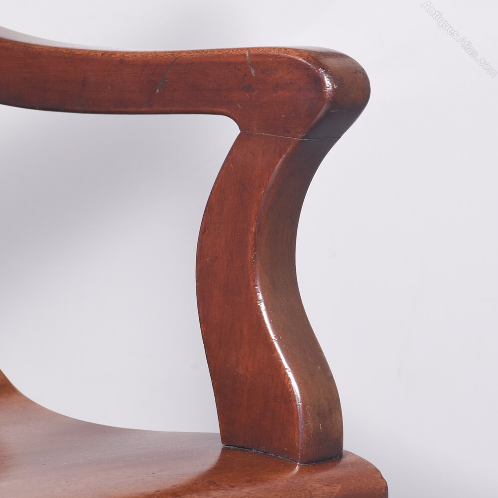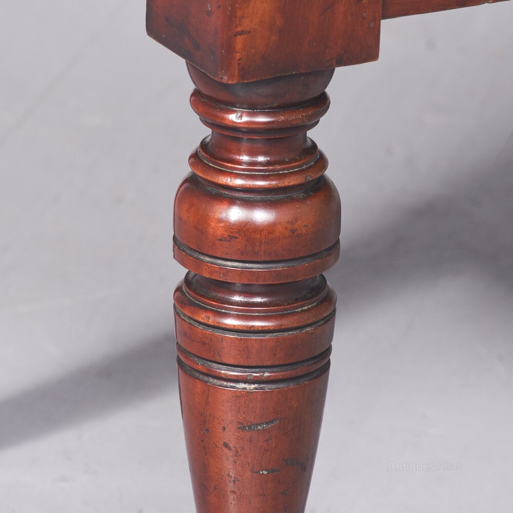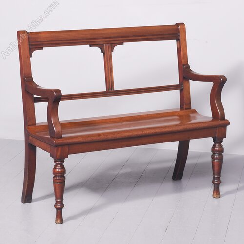 Circa 1880. A late Victorian mahogany hall bench. The rounded top rail with brackets below with a ribbed upright and a similar lower rail. The solid arms supported on shaped uprights, rest on the solid curved seat, back legs are square and out swept, front legs are turned ring turned and tapering.