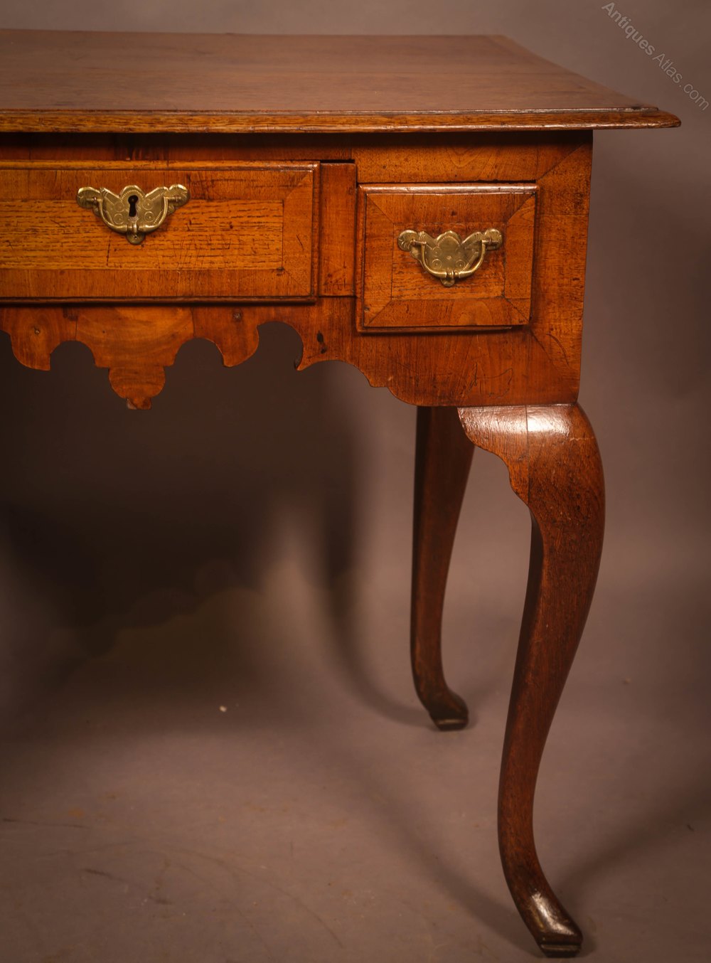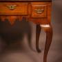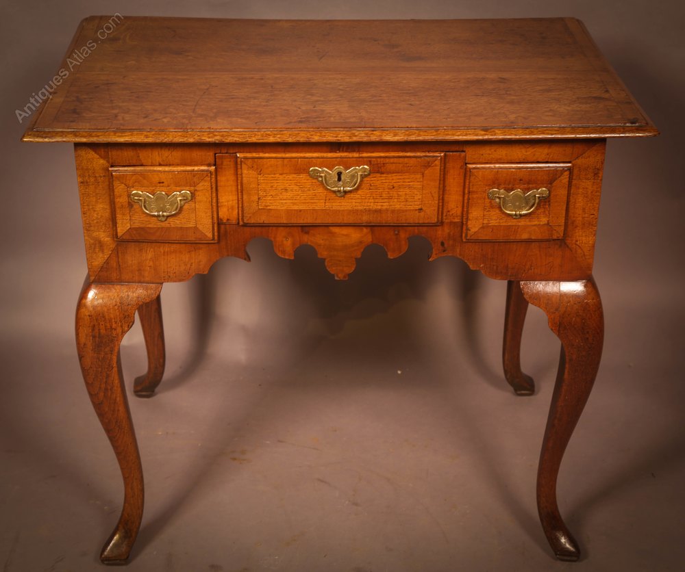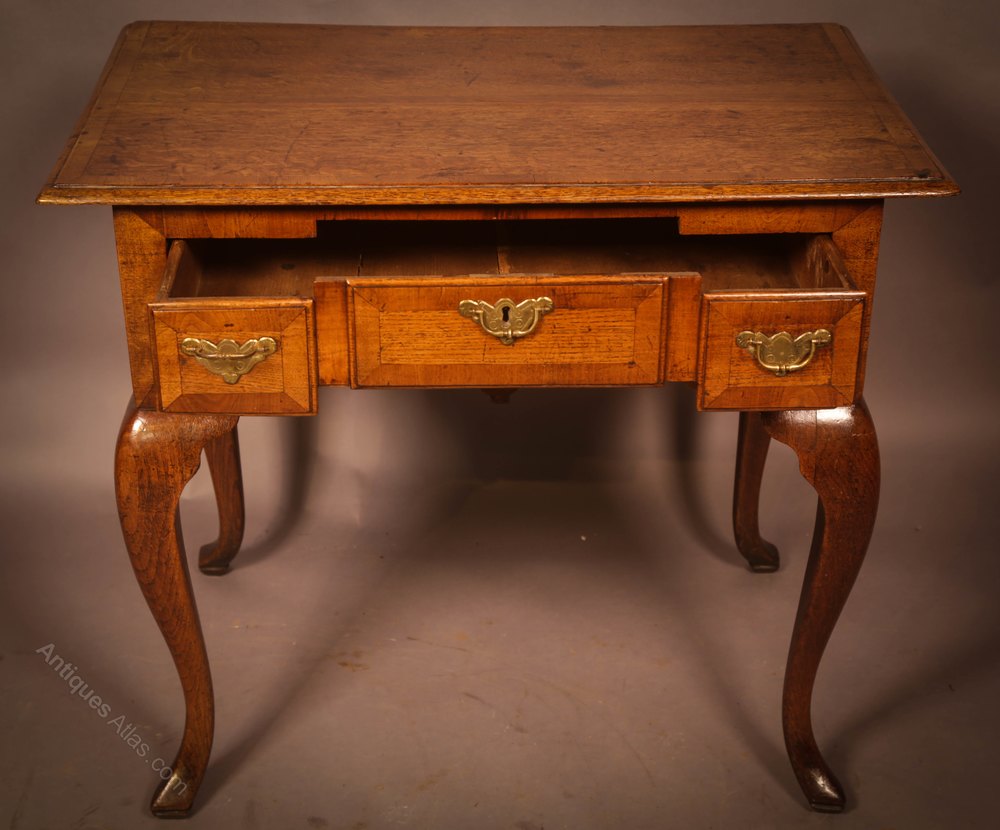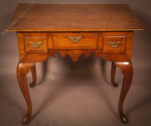 A Very unusual Low Boy in Oak the drawer appears to be three separate drawers but is actually just one, the top and drawer front is cross banded with Walnut, the handles are original, it has cabriole legs all round which are very bold I do like the shaped apron below the drawers. The condition is excellent with a good colour and patina.