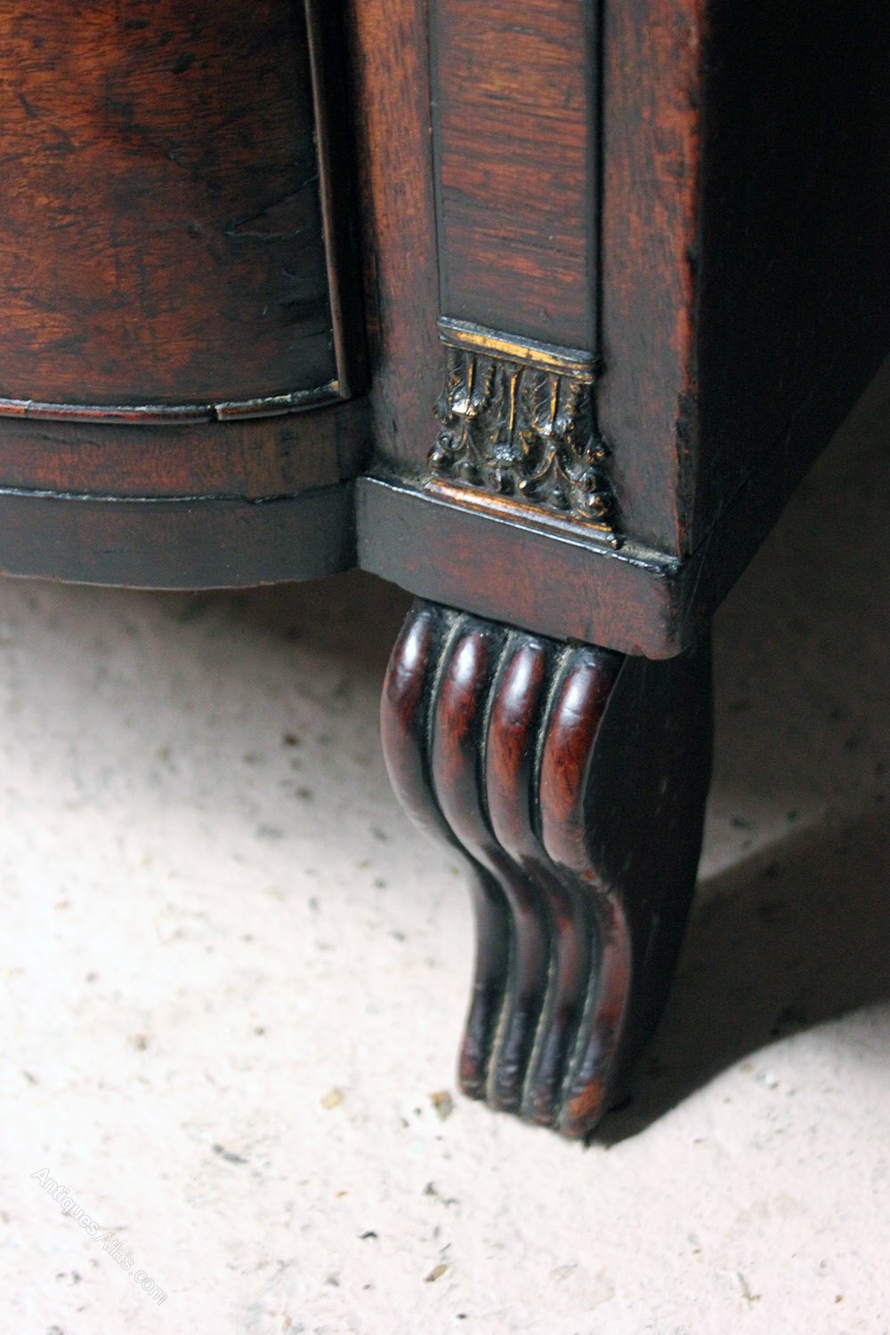 This chest displays some of the very early William IV sensibilities with the antique furniture of the Regency era becoming slightly more robust and chunky but retaining all of the Regency trademarks. We haven’t seen this particular combination of the brass Corinthian pilasters nor the reeded feet before.