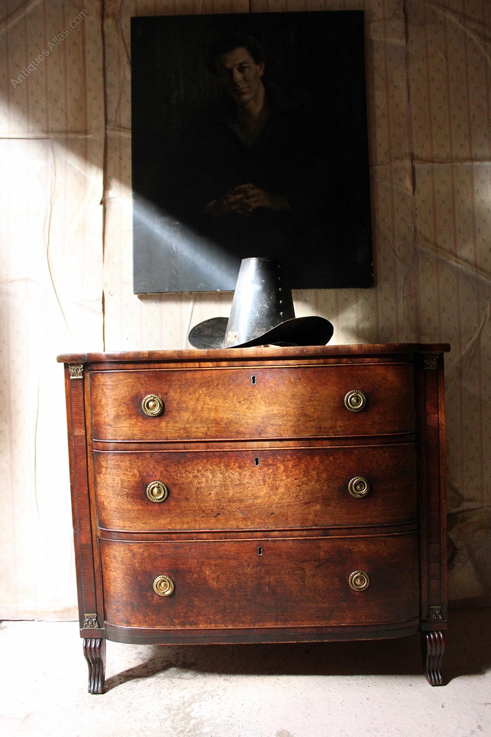 The drawers glide smoothly, the whole is sturdy and in good original order aside from the handles, which are slightly later replacements we believe, though they are of the period. The mahogany has taken on a superb patina, and commensurate with age has a few areas of loss and surface markings, with the top being wonderfully rich with darker markings as photographed. There is a fissure to one flank of the chest. We have given her an oil and hand waxed the whole but most importantly have otherwise left her as is. The original backboards are in place, with one taped repair and the feet are all original.