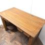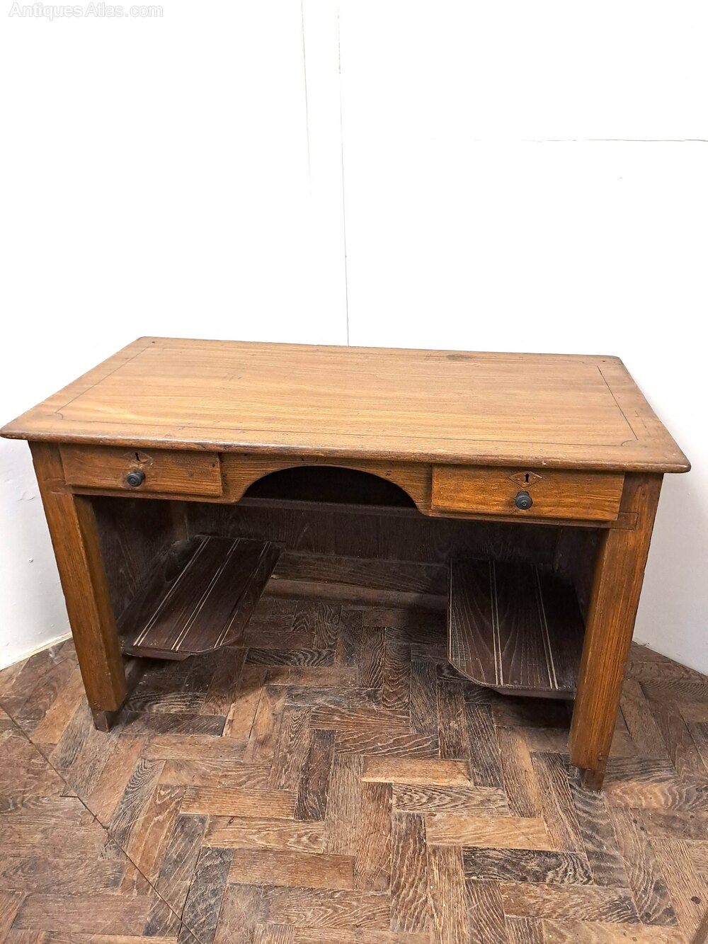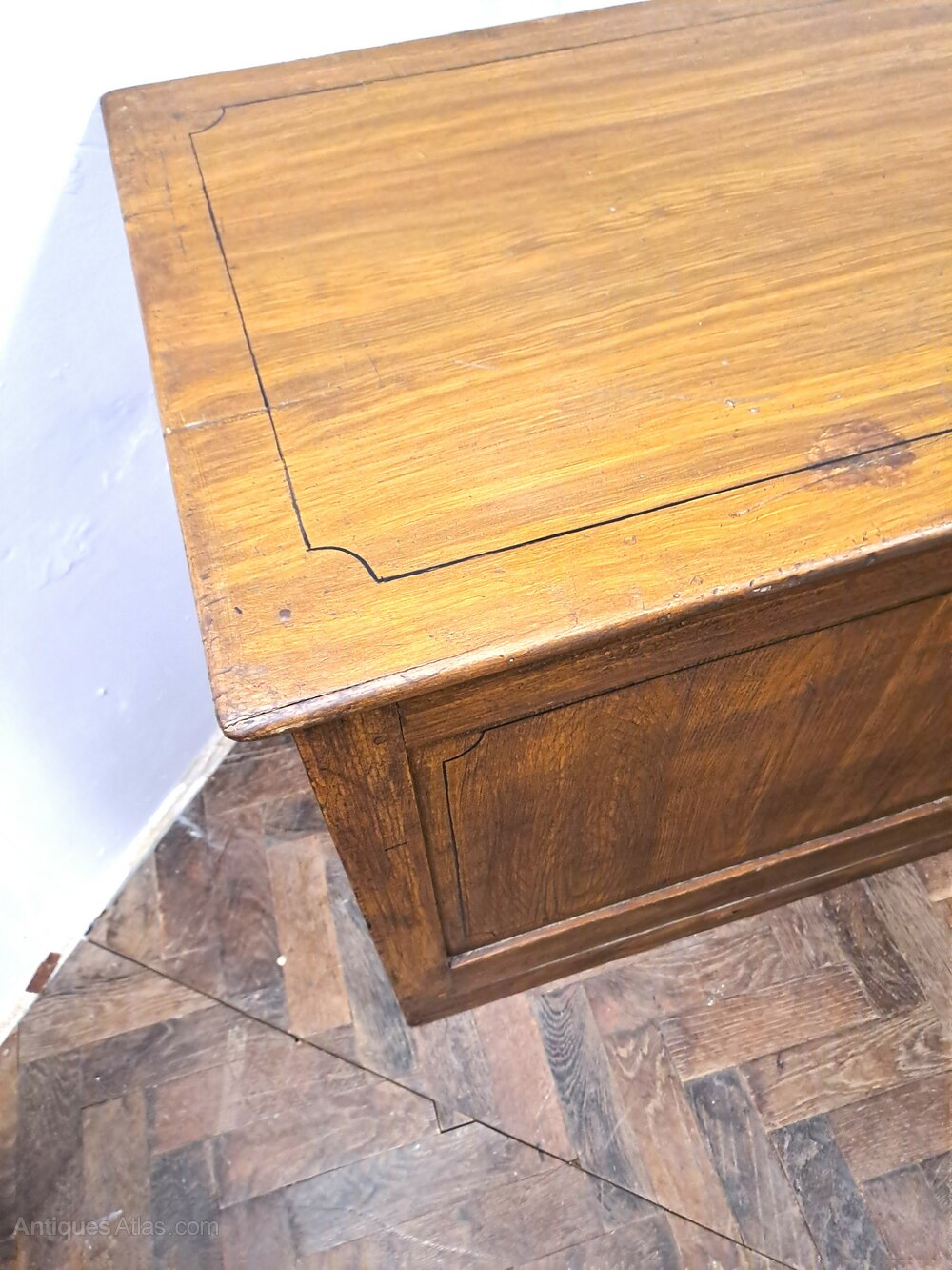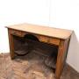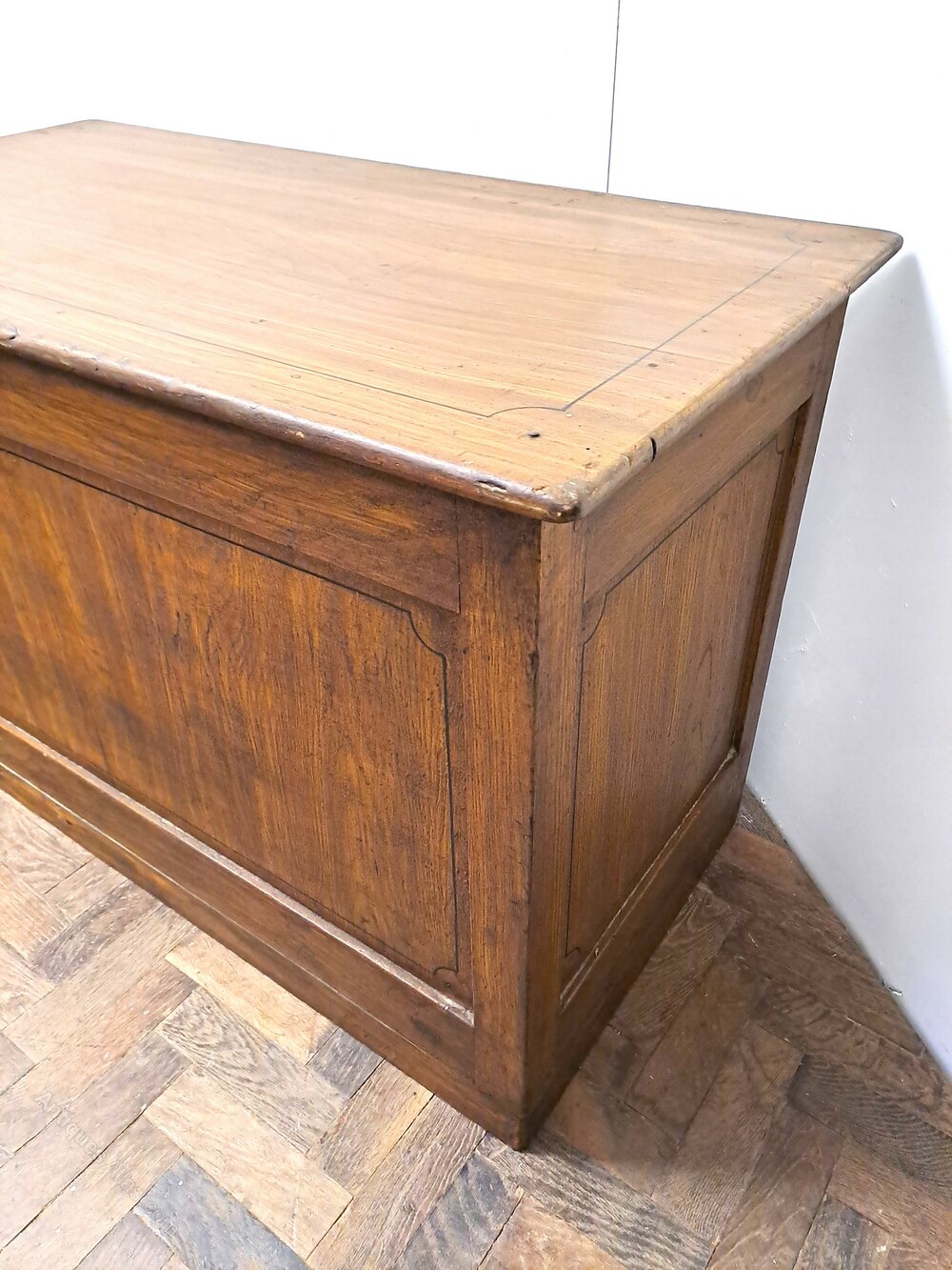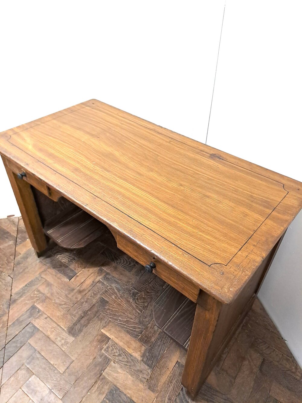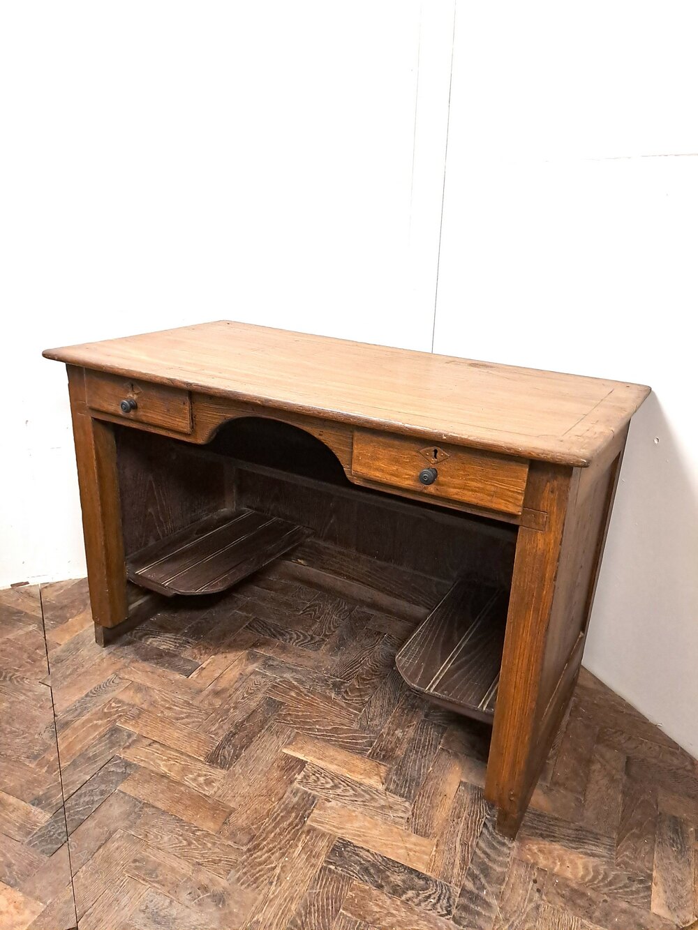 A compact and characterful counter retaining its original scumbled finish, giving the piece a warm and authentic shop-worn patina. The front is decorated with a single panel outlined by fine black line detailing with re-entrant corners—an understated but typical 19th-century French touch. To the rear are two drawers with turned knobs set above a central kneehole, flanked by fixed shelves for practical storage. A versatile small counter that works equally well in a shop, kitchen, or as a rustic desk. A genuine period piece with lovely surface wear and charm.