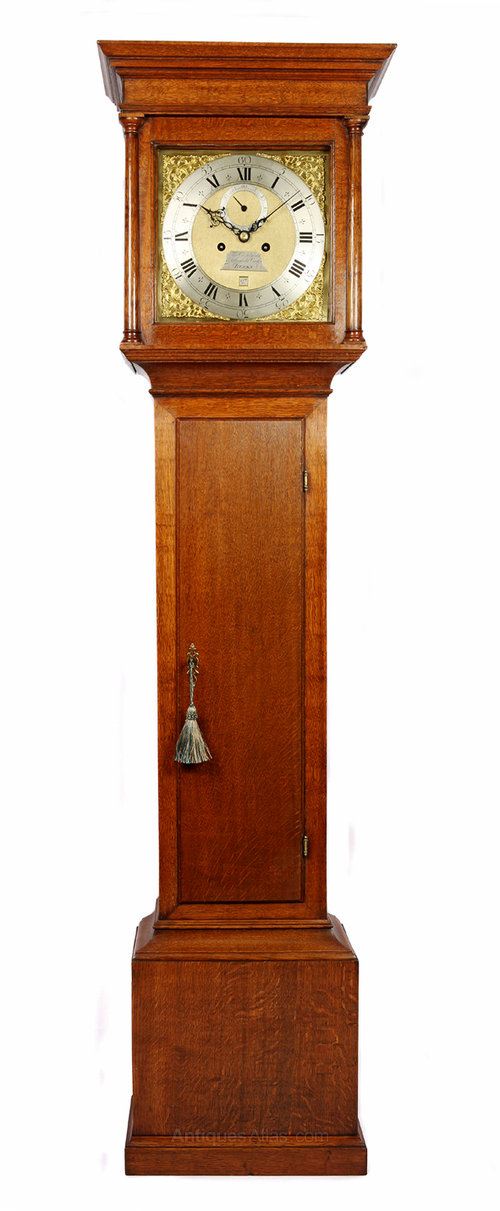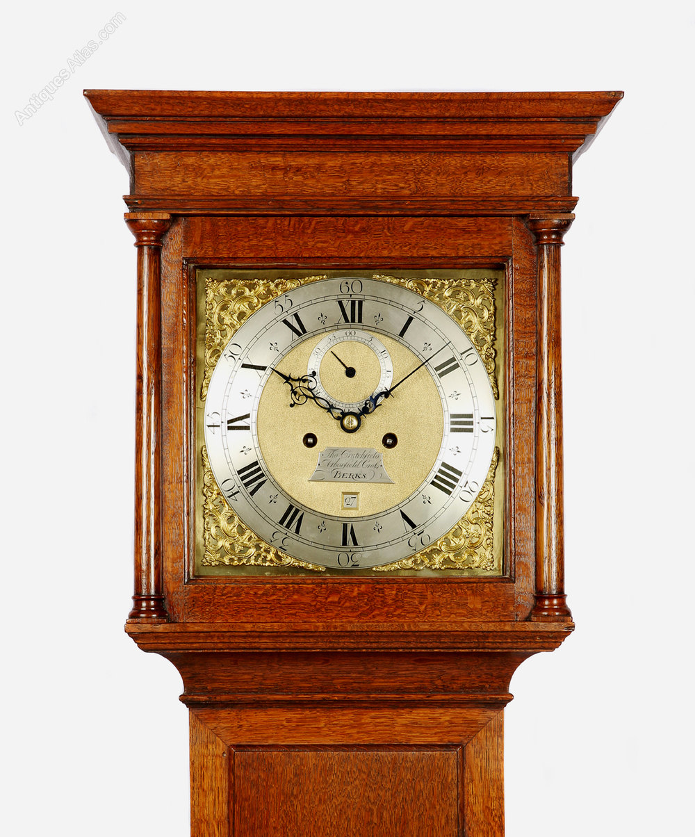 A nicely proportioned, light oak, longcase clock by Thomas Crutchfield of Arborfield Cross, and unusually signed with the county of Berkshire. 12” square brass dial with silvered chapter ring, finely matted centre and Rococo spandrels. The weight driven 8 day movement is of fine quality with (unusually for this period) a fifth latched pillar. The case of light ‘honey’ coloured oak has typical Southern features of attached hood pillars and a long trunk door.