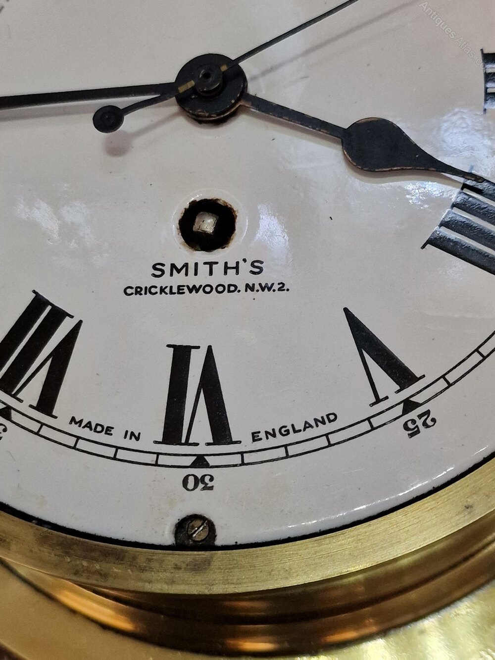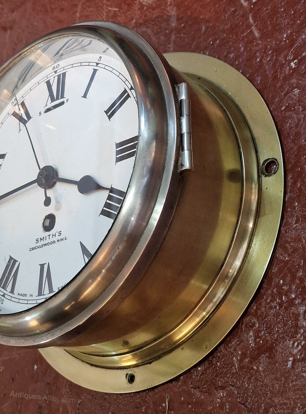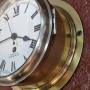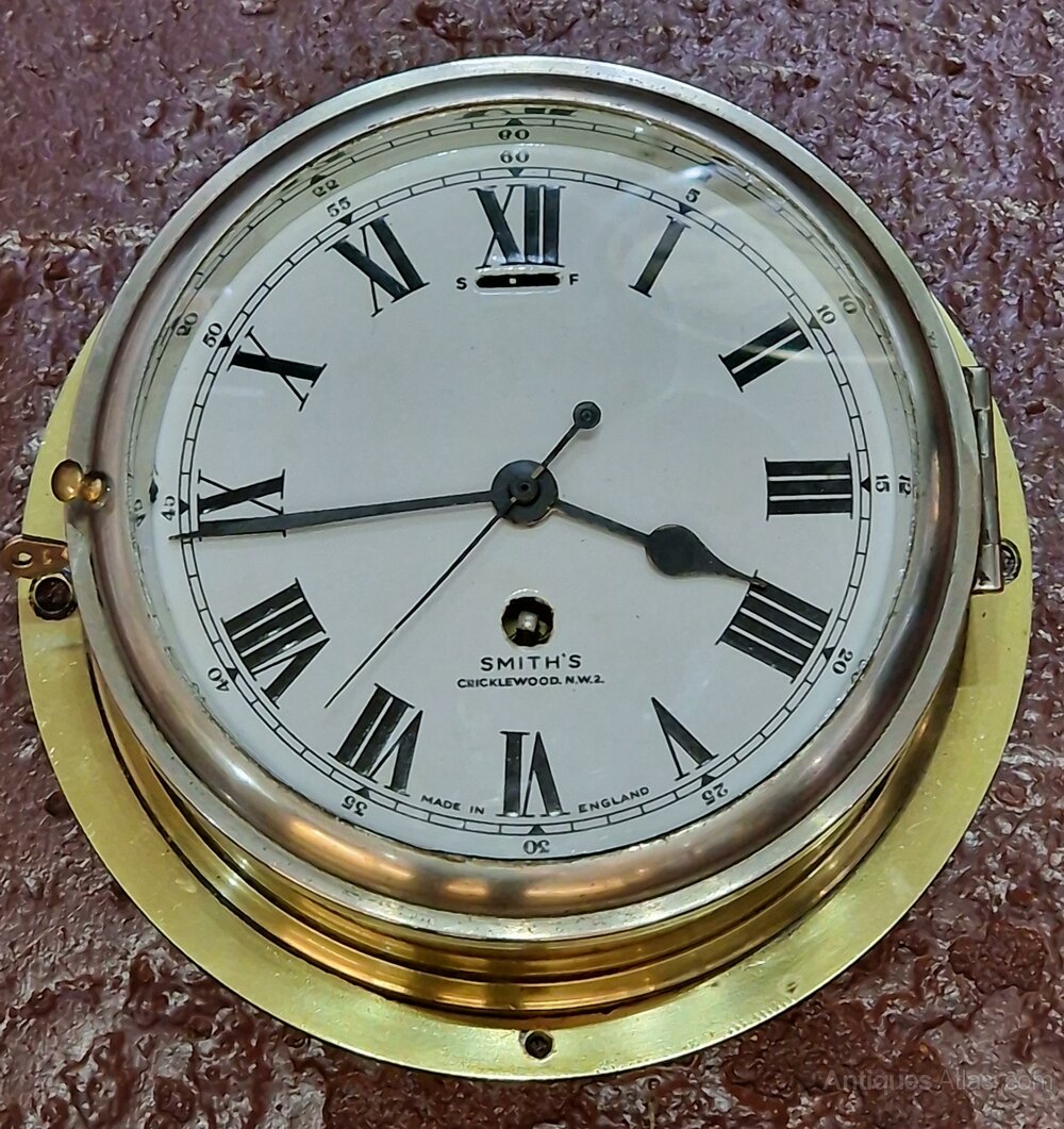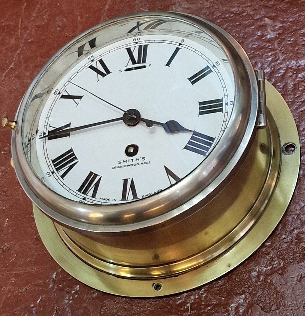 A Smiths ships bulkhead antique clock. Bevelled glass to the chrome opening front bezel. A good quality brass case. A 7" 'true' enamel dial with a sweep seconds hand. Signed 'SMITHS CRICKLEWOOD N.W.2'. A 7-day timepiece mechanism. Circa 1950.