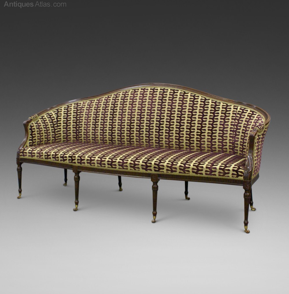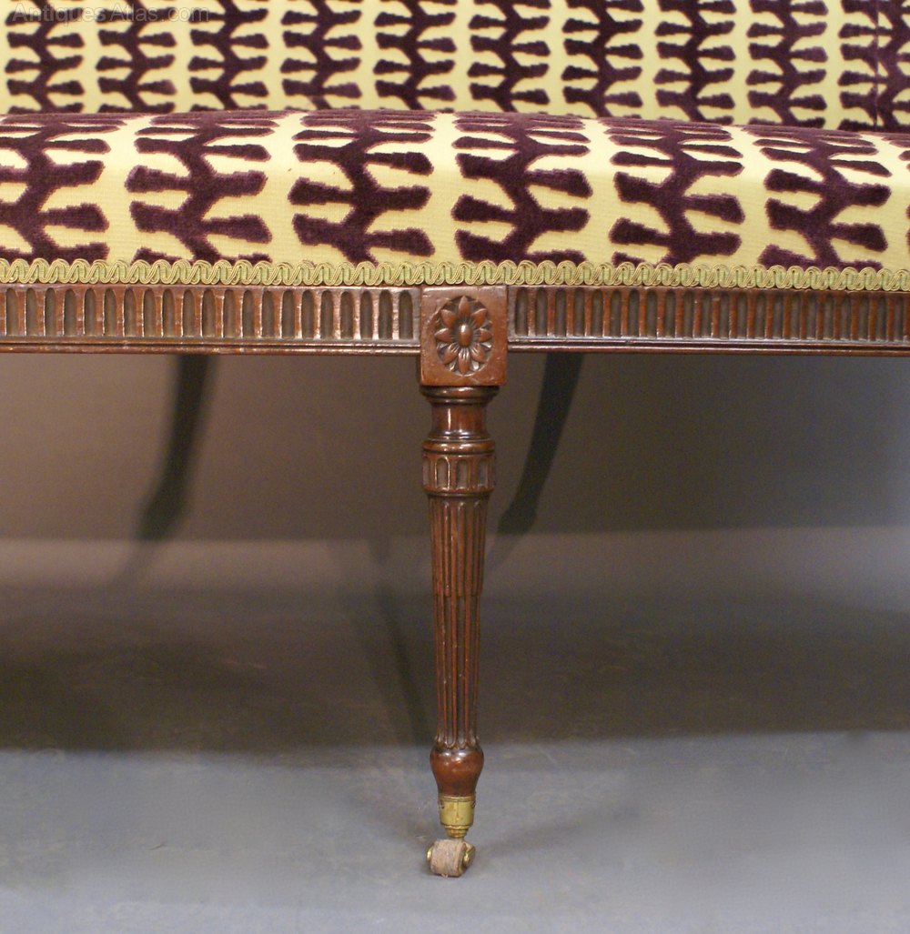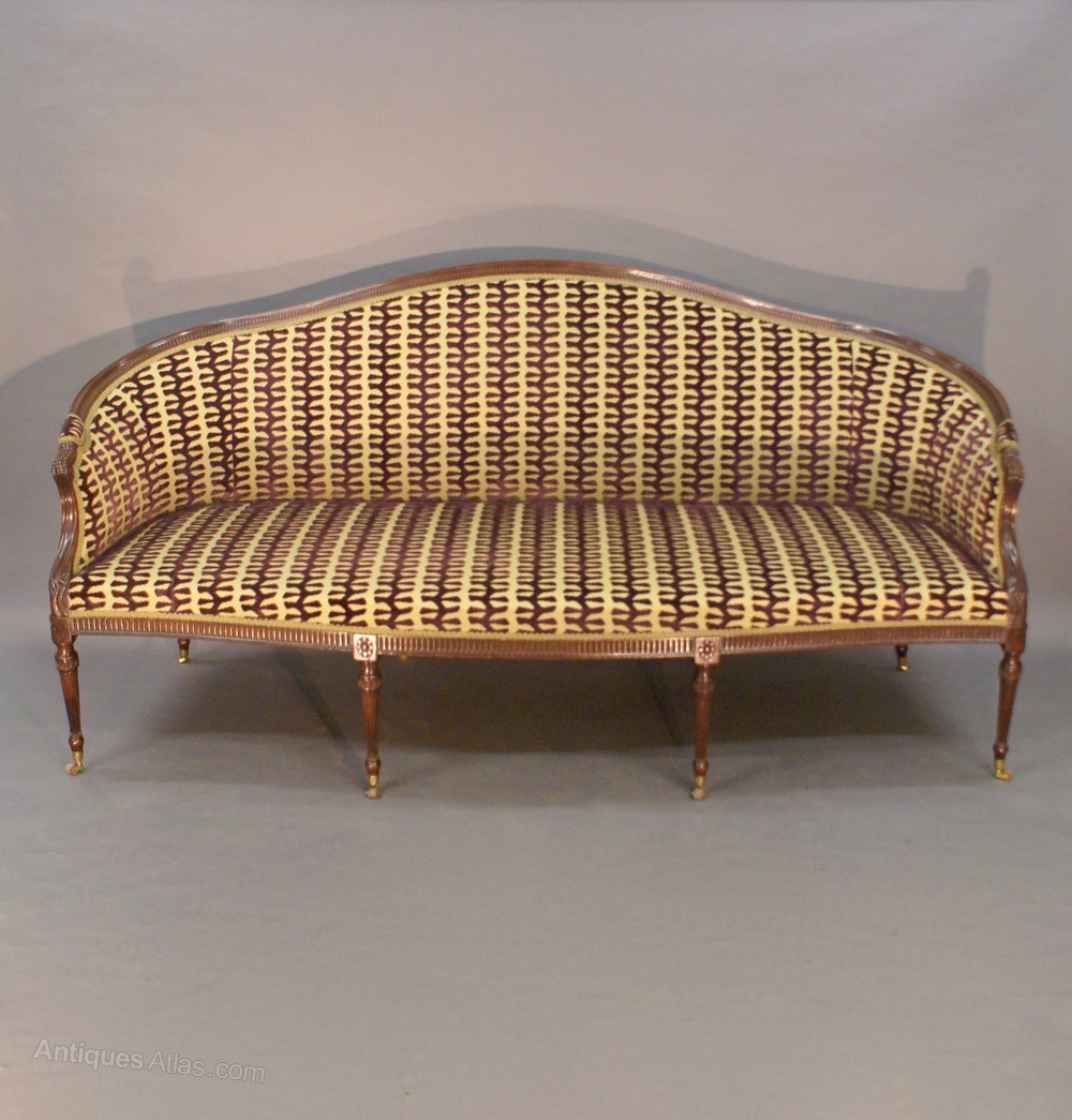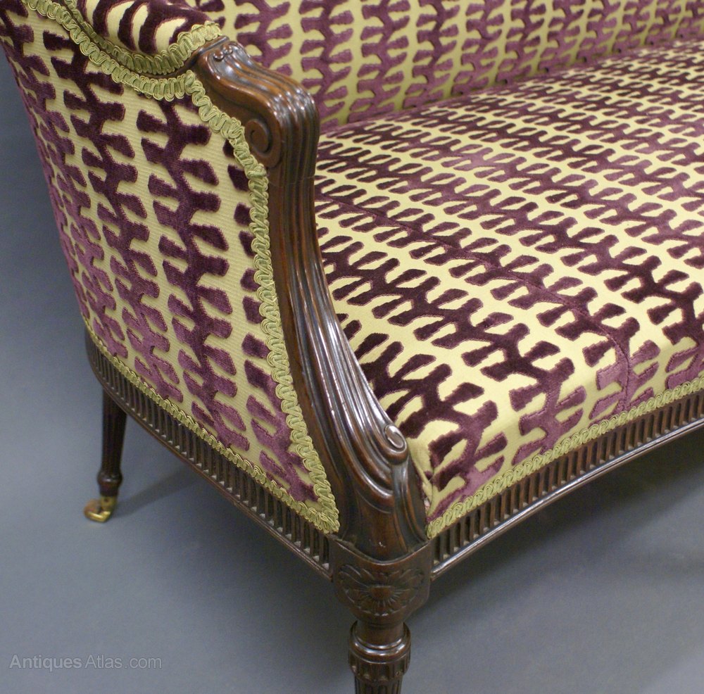 A superb and very elegant Hepplewhite Revival sofa. Beautifully made in dense mahogany, the sofa stands on eight turned and stop-fluted legs with brass and leather castors with patera atop. The seat rail and back are fluted and the scroll arms are finely carved. The sofa has been expertly upholstered and is in very good condition. 930mm high, 1960mm wide, 740mm deep and 440mm seat height. English. Circa 1890.