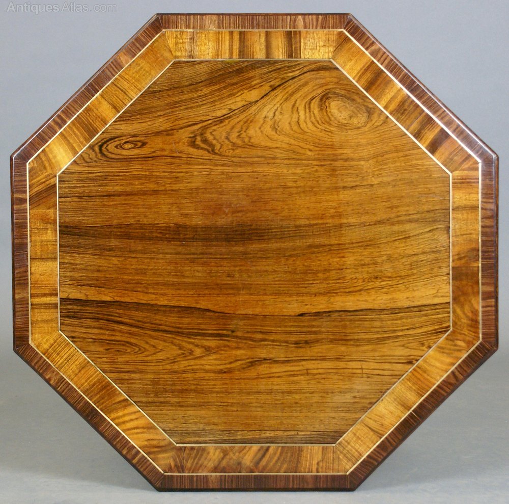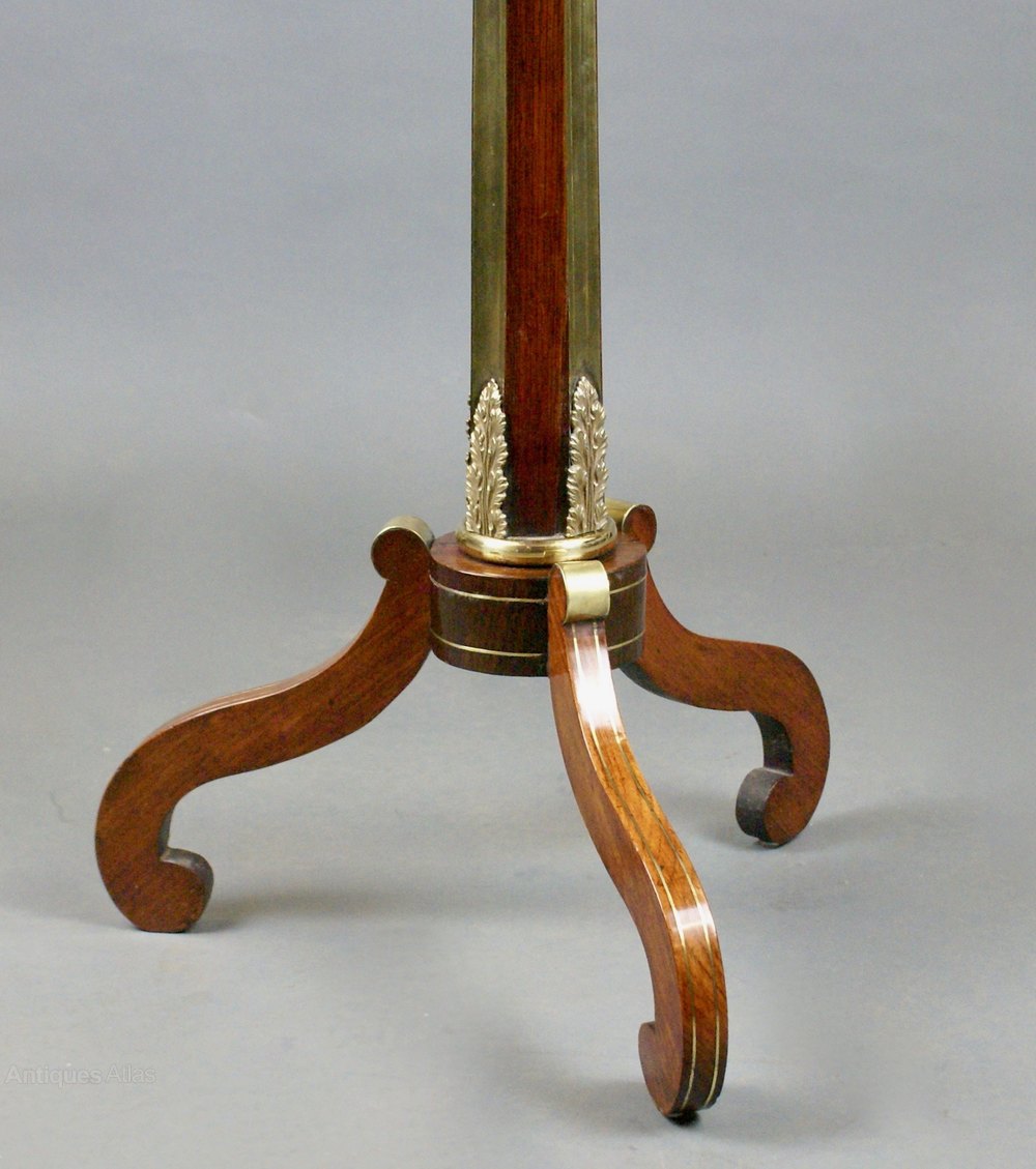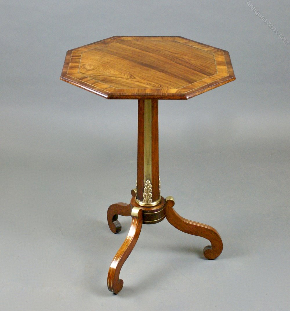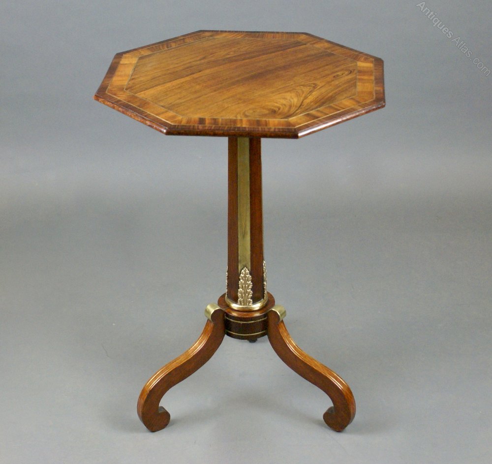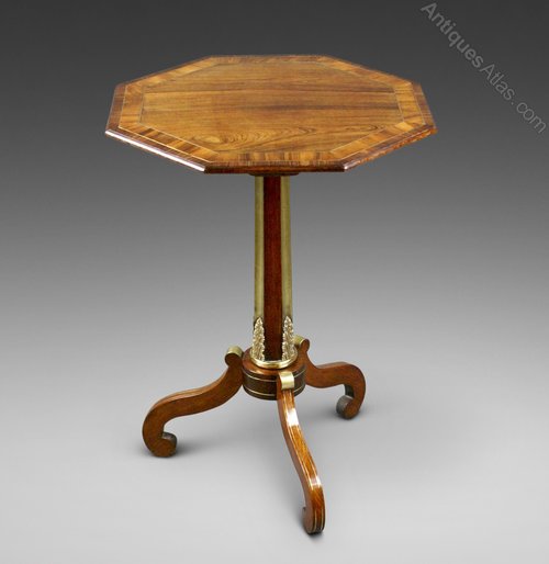 A superb Regency rosewood tripod table. The top being double banded in King wood and Goncarlo Alves and with the addition of brass line inlay. The base has a faceted column with alternating rosewood and brass faces, The table stands on "S" scroll legs also with brass line inlay. In very good condition, retaining all its original elements and of a good colour. 710mm high, 510mm wide and 510mm deep. English. Circa 1830.