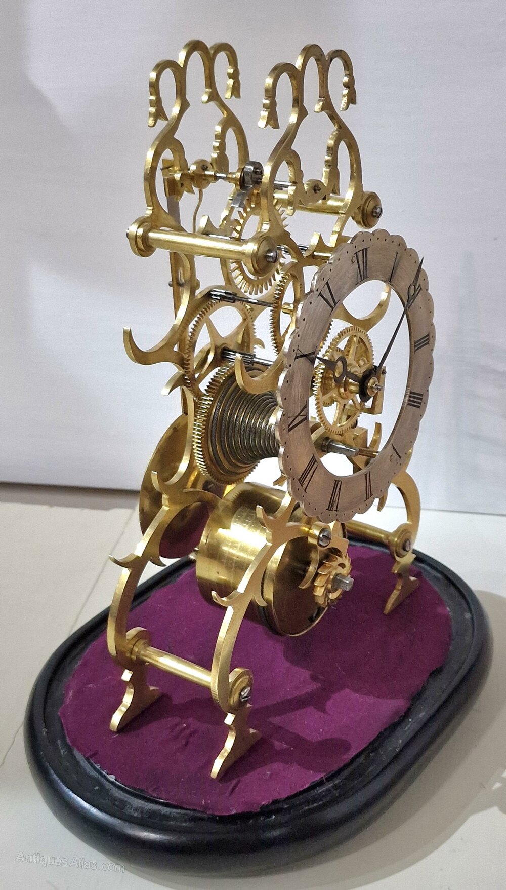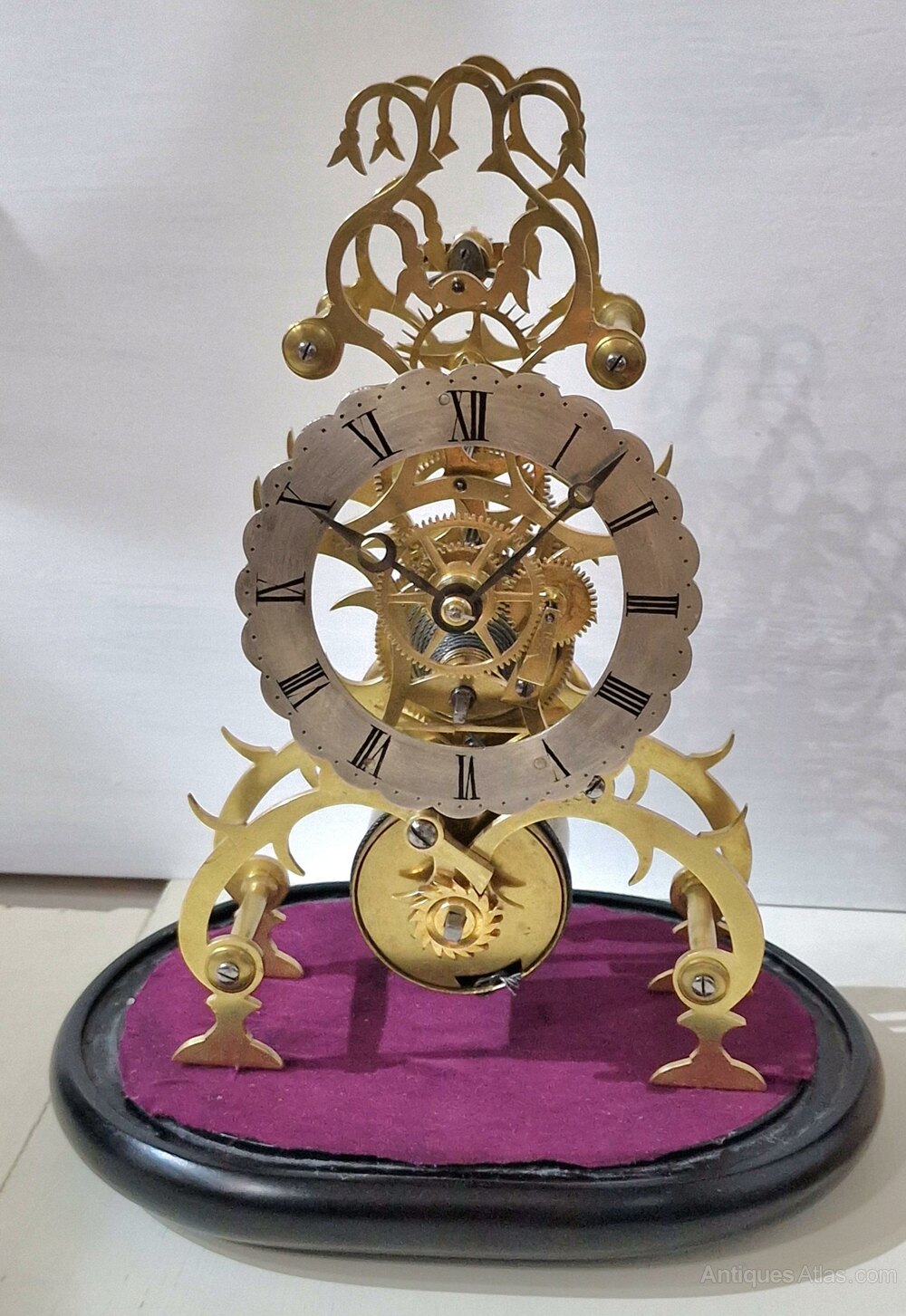 A good quality Victorian skeleton clock. A Victorian glass dome to the ebonised base standing on shaped feet. A brass frame with lovely fretted detailing. A silvered dial with Roman numerals and 'moon' blued steel hands. An 8-day duration fusee mechanism. Circa 1875.