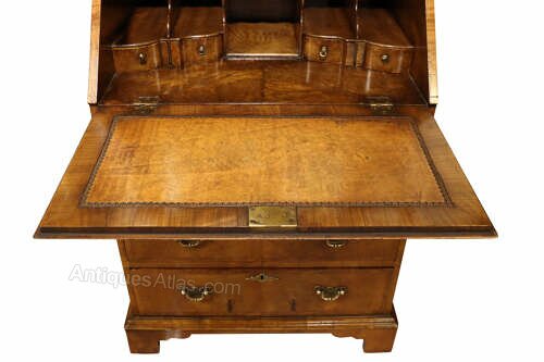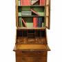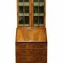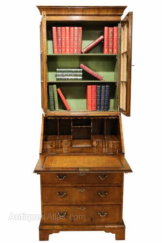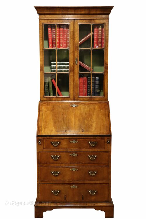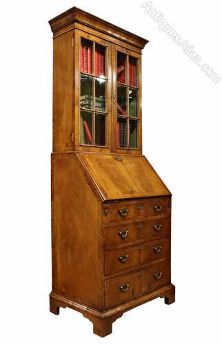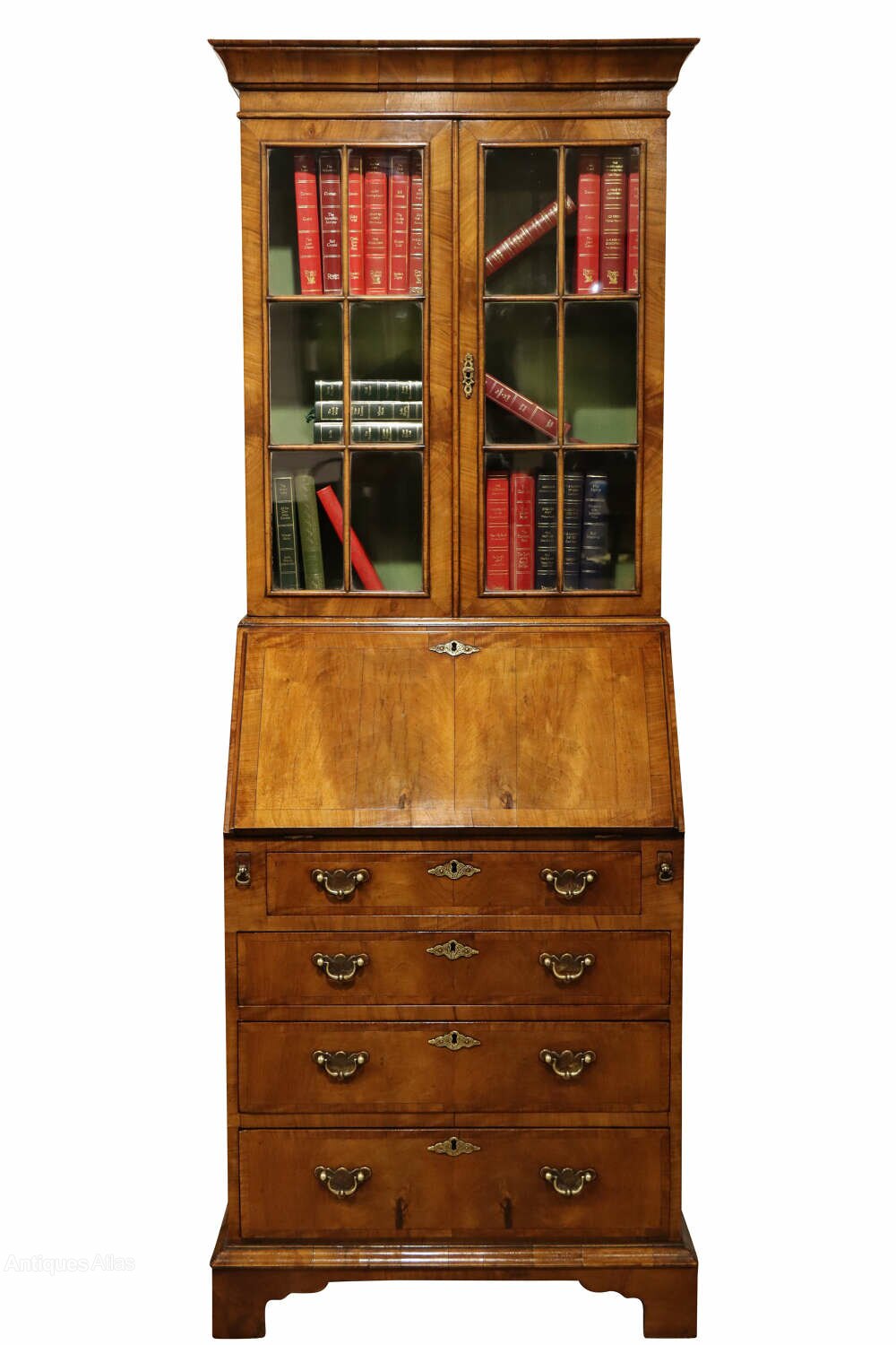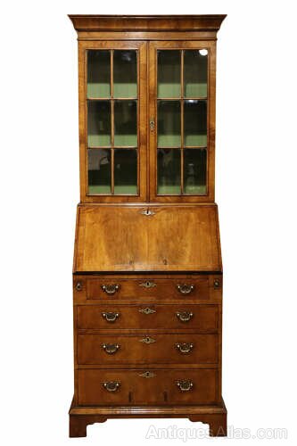 A charming walnut bureau bookcase of small proportions, the fall front opening to reveal a fitted interior with pigeonholes and small drawers above a tooled leather writing surface. The upper section with a pair of astragal glazed doors enclosing two shelves, framed by crossbanded detail and cross grain mouldings to the cornice and doors. The lower section fitted with four oak-lined graduated drawers, each with brass swan-neck handles, raised on bracket feet. Retains two working keys.