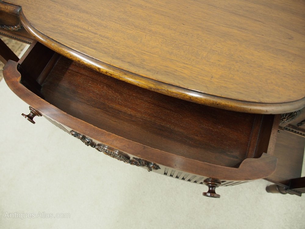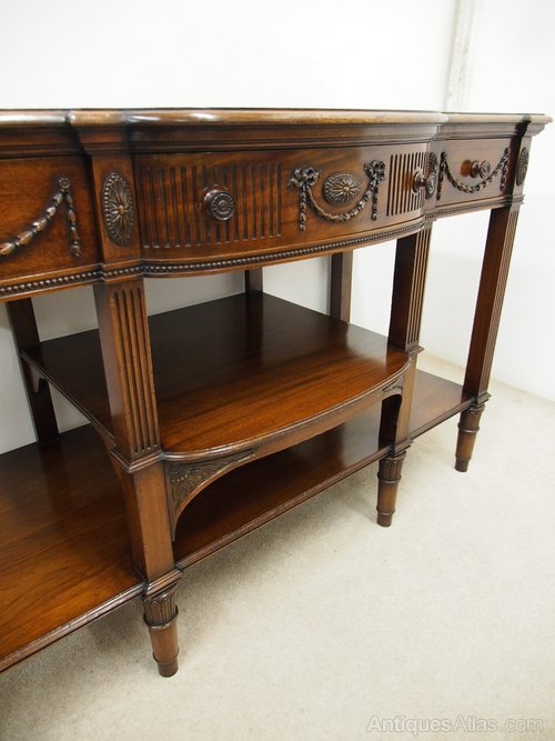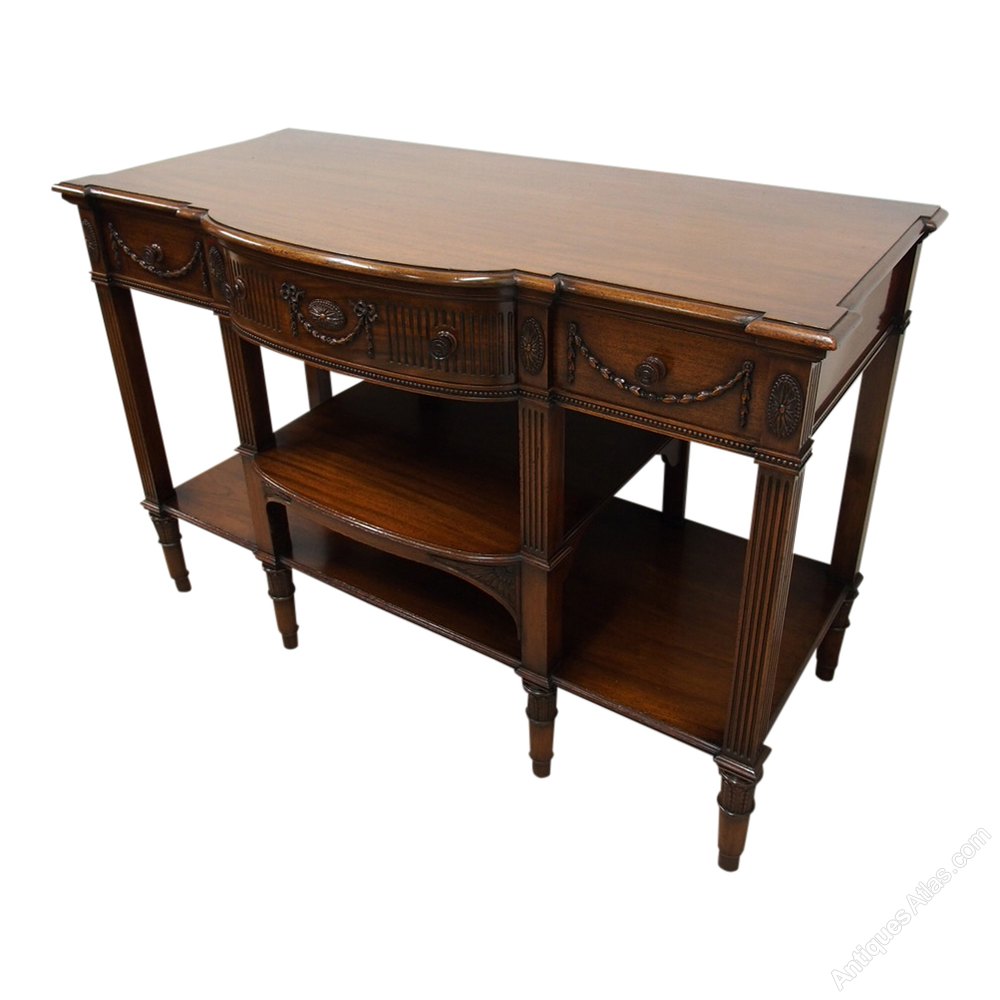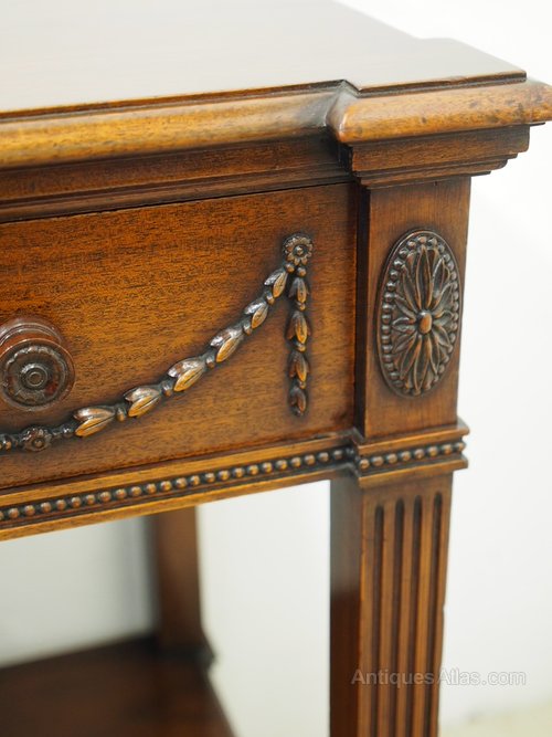 Circa 1900, Adams style mahogany side or hall table. The shaped mahogany top with a moulded rim sits over a neoclassical decorated frieze with three frieze drawers, and is all decorated with vertical fluting, husk swags and oval paterae. It is standing on square fluted supports with double under shelves all above turned fluted legs.