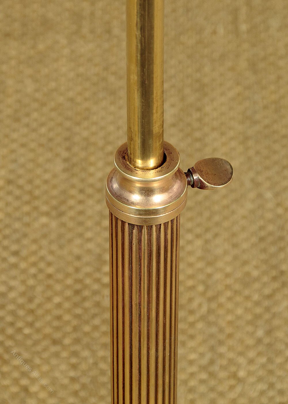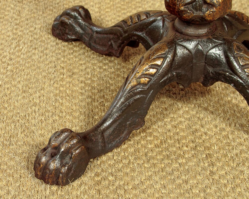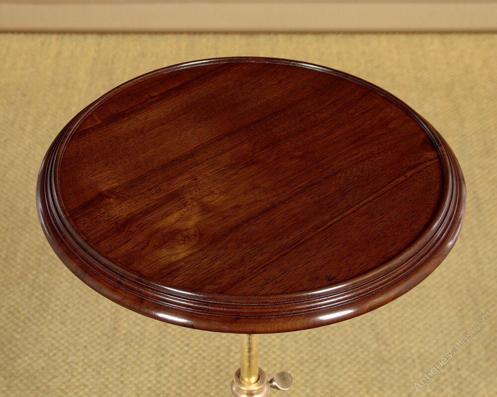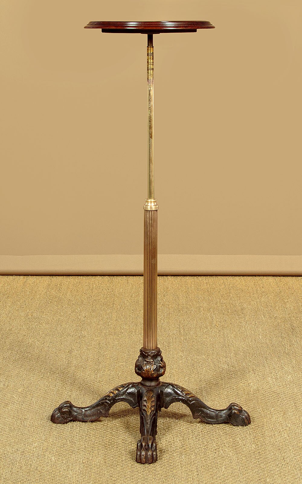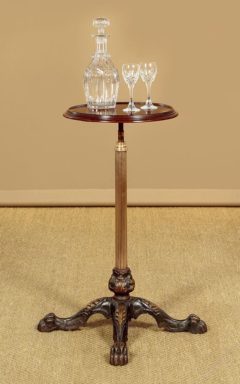 Good quality late 19th.c adjustable wine table c.1890. 15" diameter walnut table top with a crisp moulded edge and raised lip. Height adjustable from 28" - 44" on a telescopic brass column with reeded outer. On a heavy cast iron base with claw feet and gilded detail. Excellent colour and condition, cleaned and waxed in our workshops.