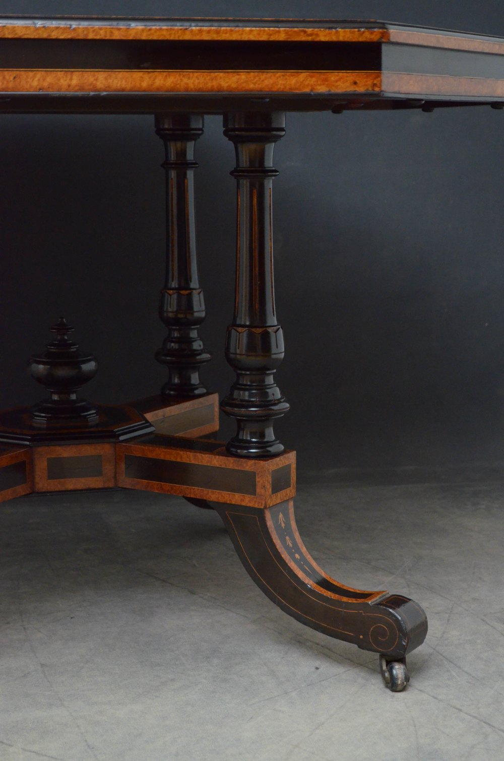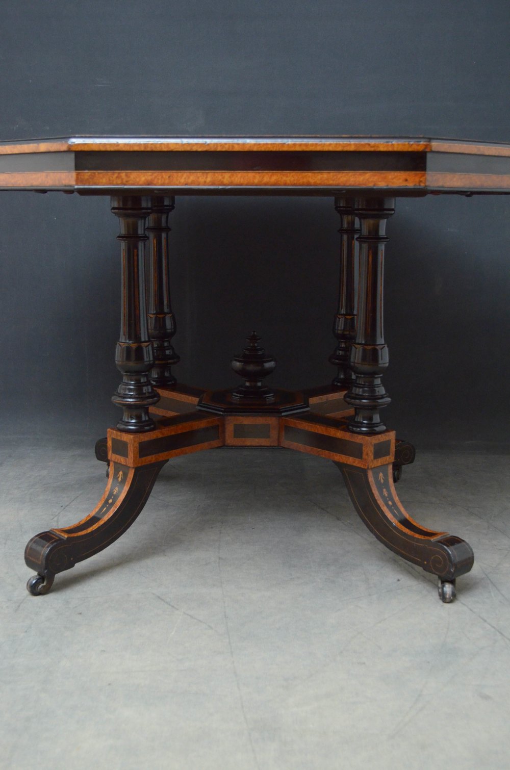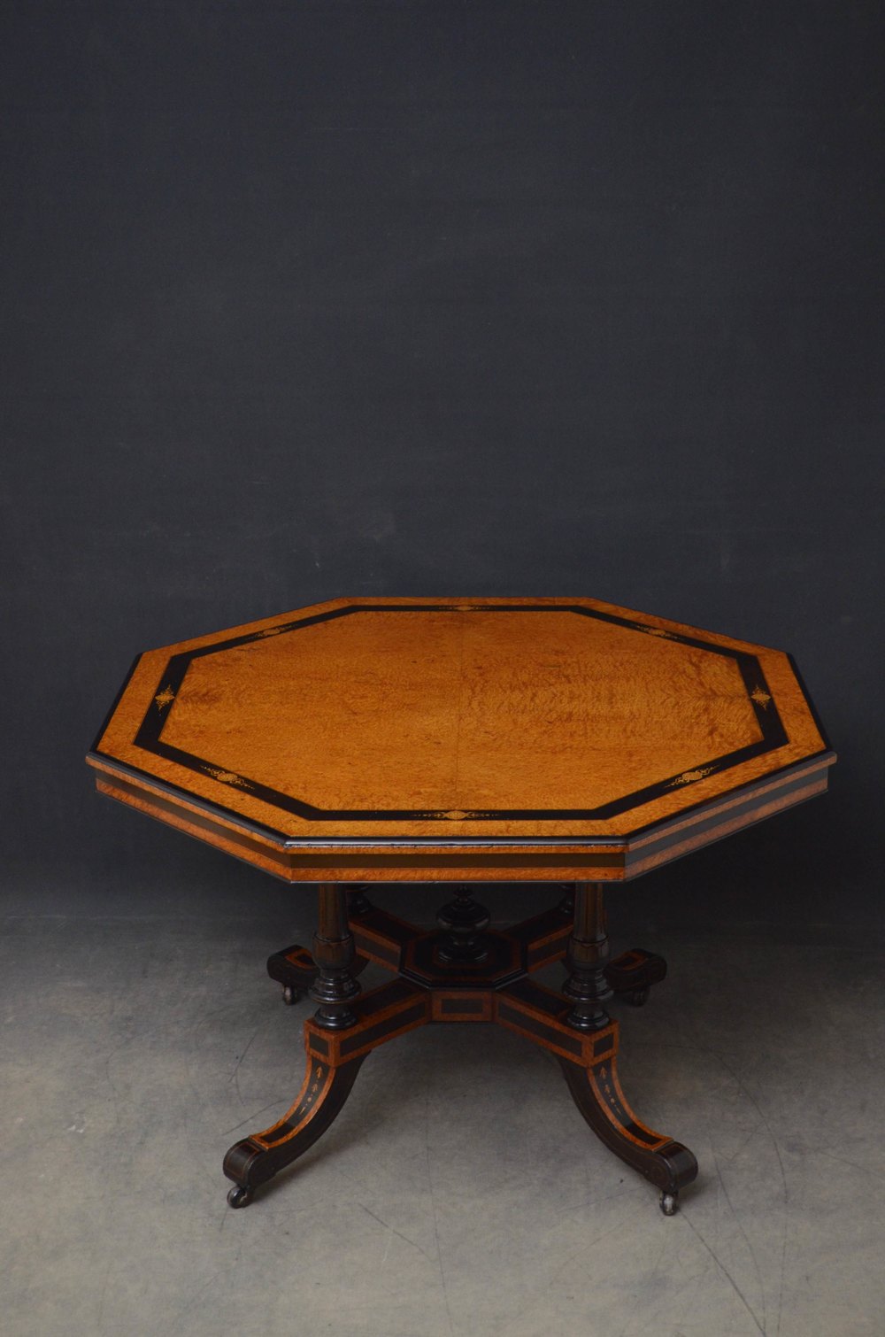 Sn5153 Superb Victorian Aesthetic Movement thuya wood centre table, having octagonal top with ebonised banding and satinwood inlays and shallow moulded and ebonised frieze, standing on four turned, reeded and gilded supports terminating in inlaid and ebonised downswept legs and castors all united by cross stretchers with decorative finial to the centre. This antique table retains its original finish and soft colour, all in excellent home ready condition. c1880