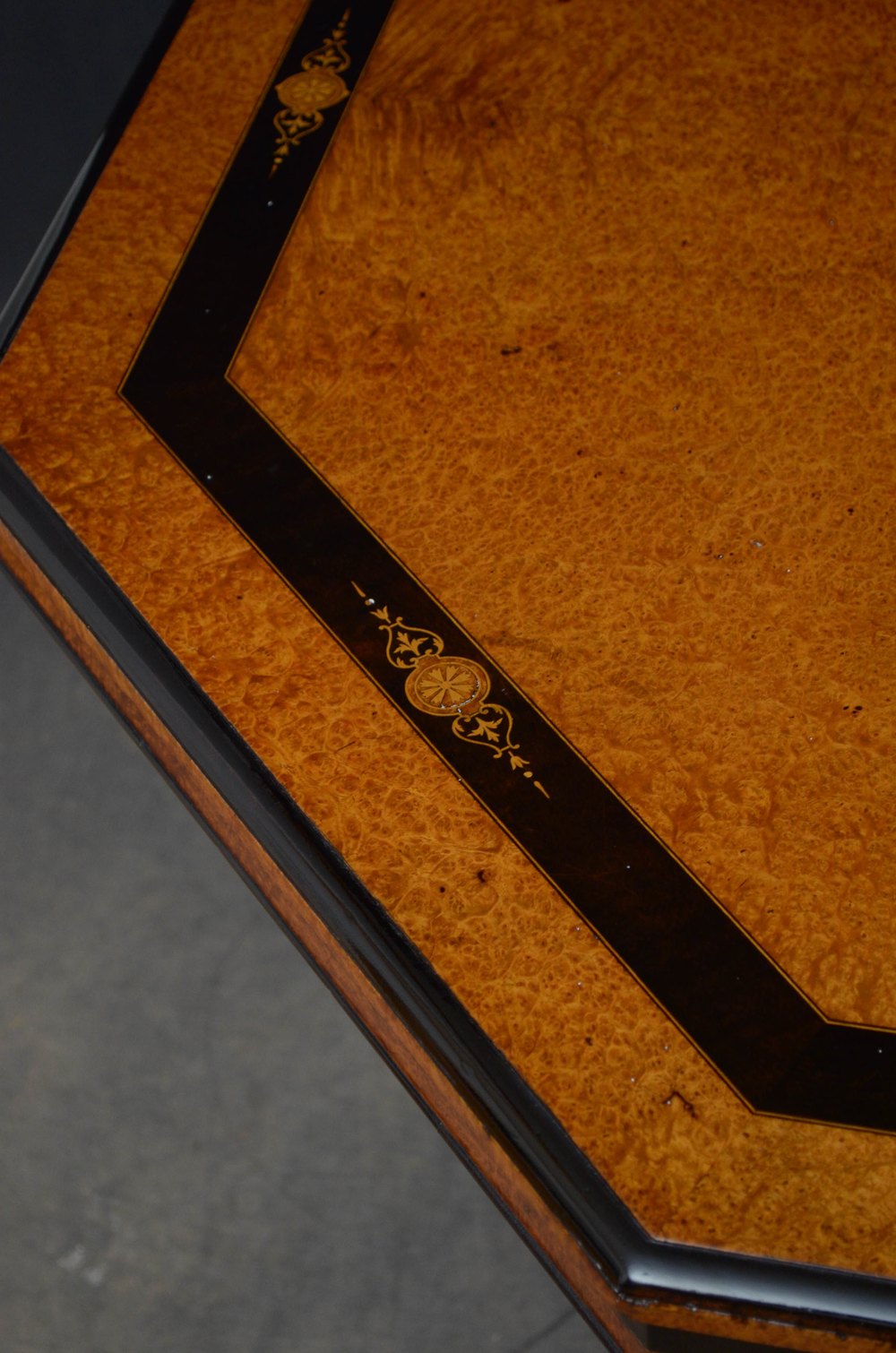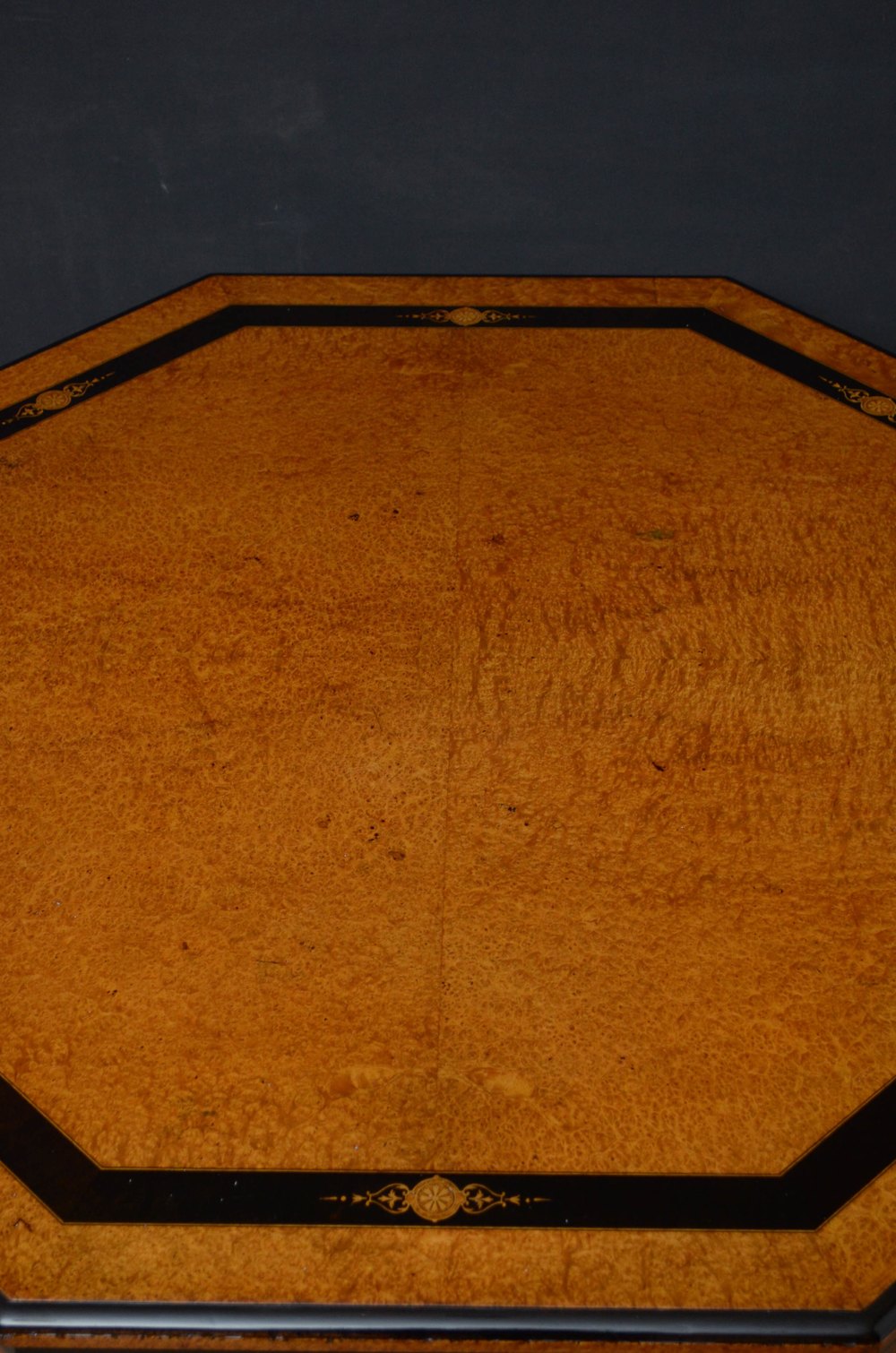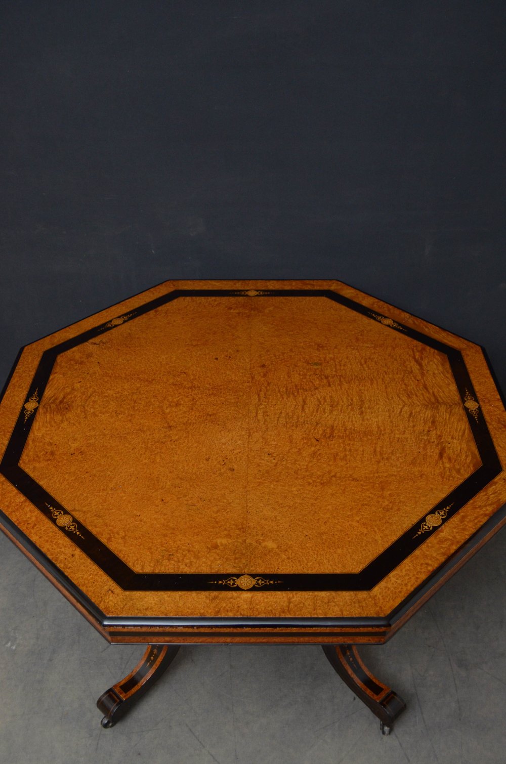 Sn5153 Superb Victorian Aesthetic Movement thuya wood centre table, having octagonal top with ebonised banding and satinwood inlays and shallow moulded and ebonised frieze, standing on four turned, reeded and gilded supports terminating in inlaid and ebonised downswept legs and castors all united by cross stretchers with decorative finial to the centre. This antique table retains its original finish and soft colour, all in excellent home ready condition. c1880