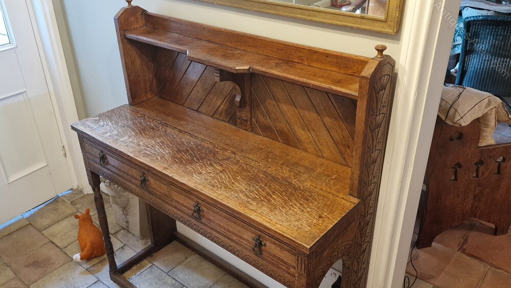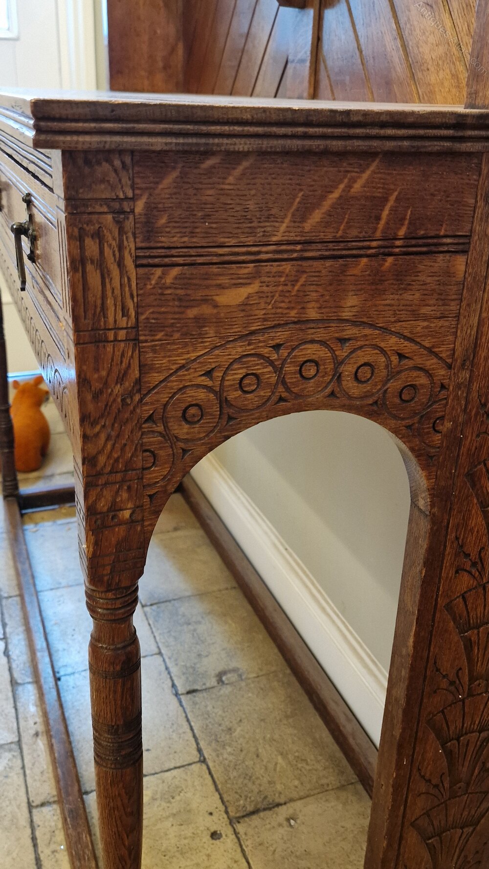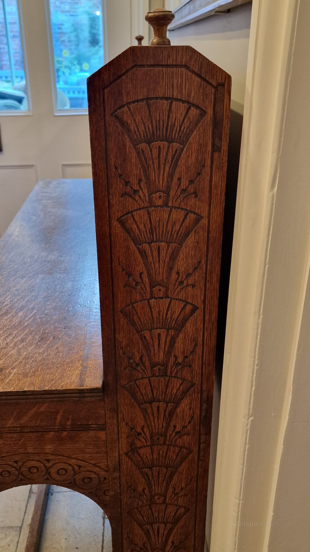 An Arts & Crafts, Aesthetic Oak Side / Hall Table after Christopher Dresser c.1880. This is a quality pice - Beautifully constructed in solid, quarter sawn oak with fine (London) dovetails and pegged joints. Original Brassware.