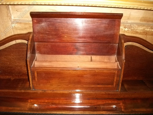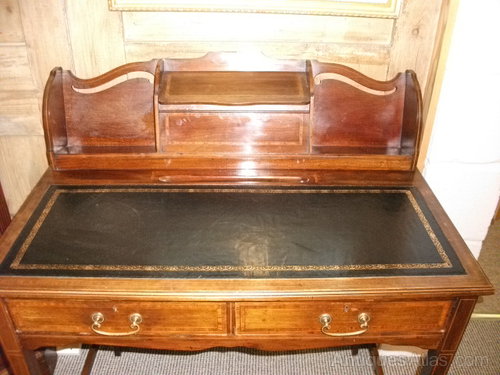 An elegant and quality Edwardian writing table in mahogany with generous amounts of Satinwood banding and stringing even on the legs and serpentine stretcher. It has a pen rest, a hinged stationary compartment and a new tooled leather writing surface.