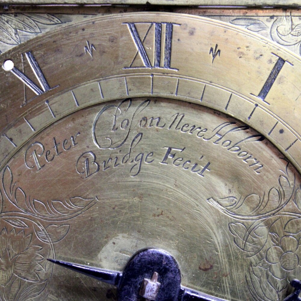 The dial plate is engraved with a floral design with a blank area containing the maker's name of "Peter Closon Near Holborn Bridge Fecit" curving under the upper chapter ring. The chapter ring has 2 outer rings, short Roman hour numerals, wheat stalk half hour marks and an inner, divided quarter track. The blackened iron hand is well executed.