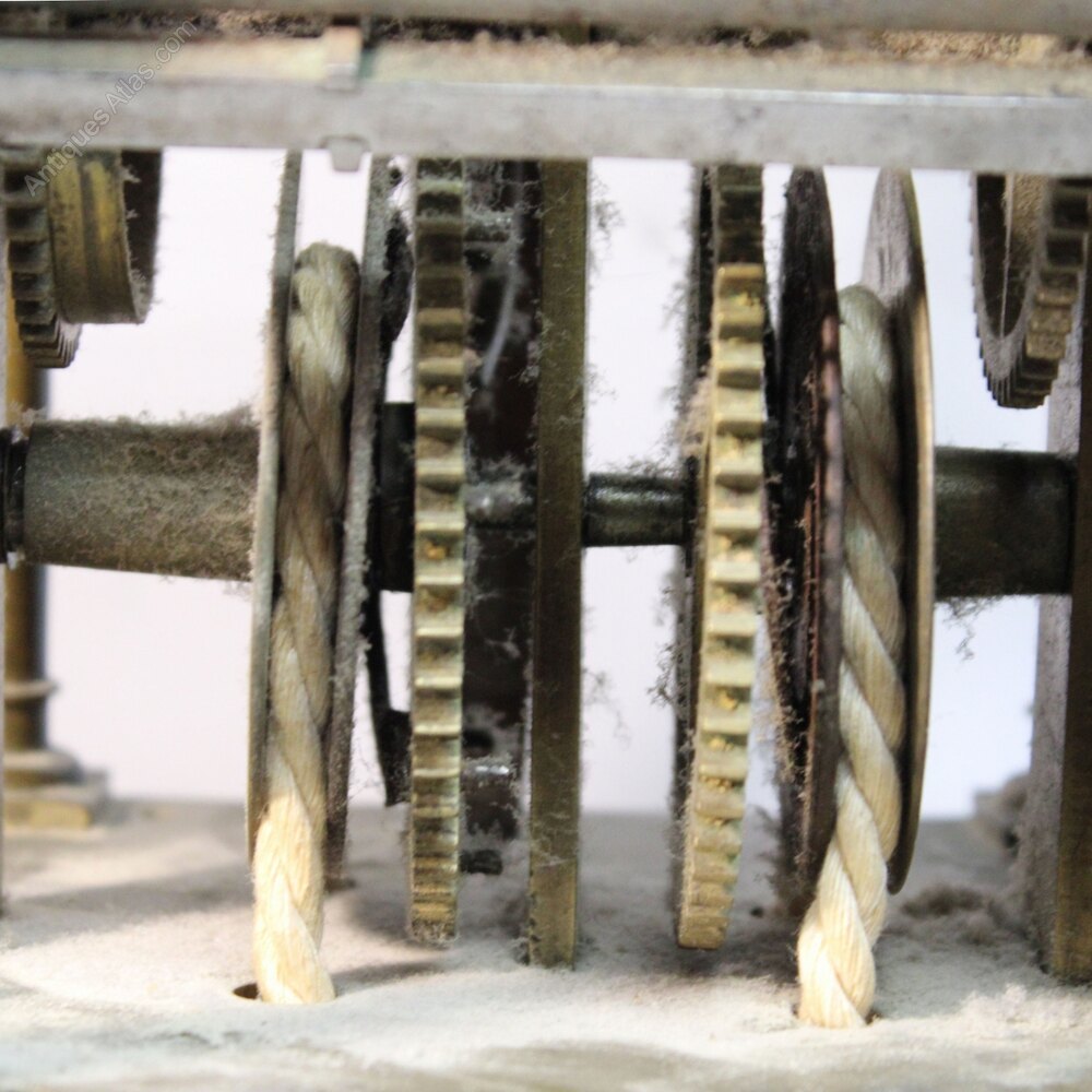 The short duration, separately wound wheel trains with tapered and un-colleted arbors and large pinions. Now having a long pendulum, Anchor Recoil escapement and the wheel trains are mounted in the usual way in 3 upright narrow plates. Countwheel striking the hours with a large hammer head within the top-mounted, cast bell.